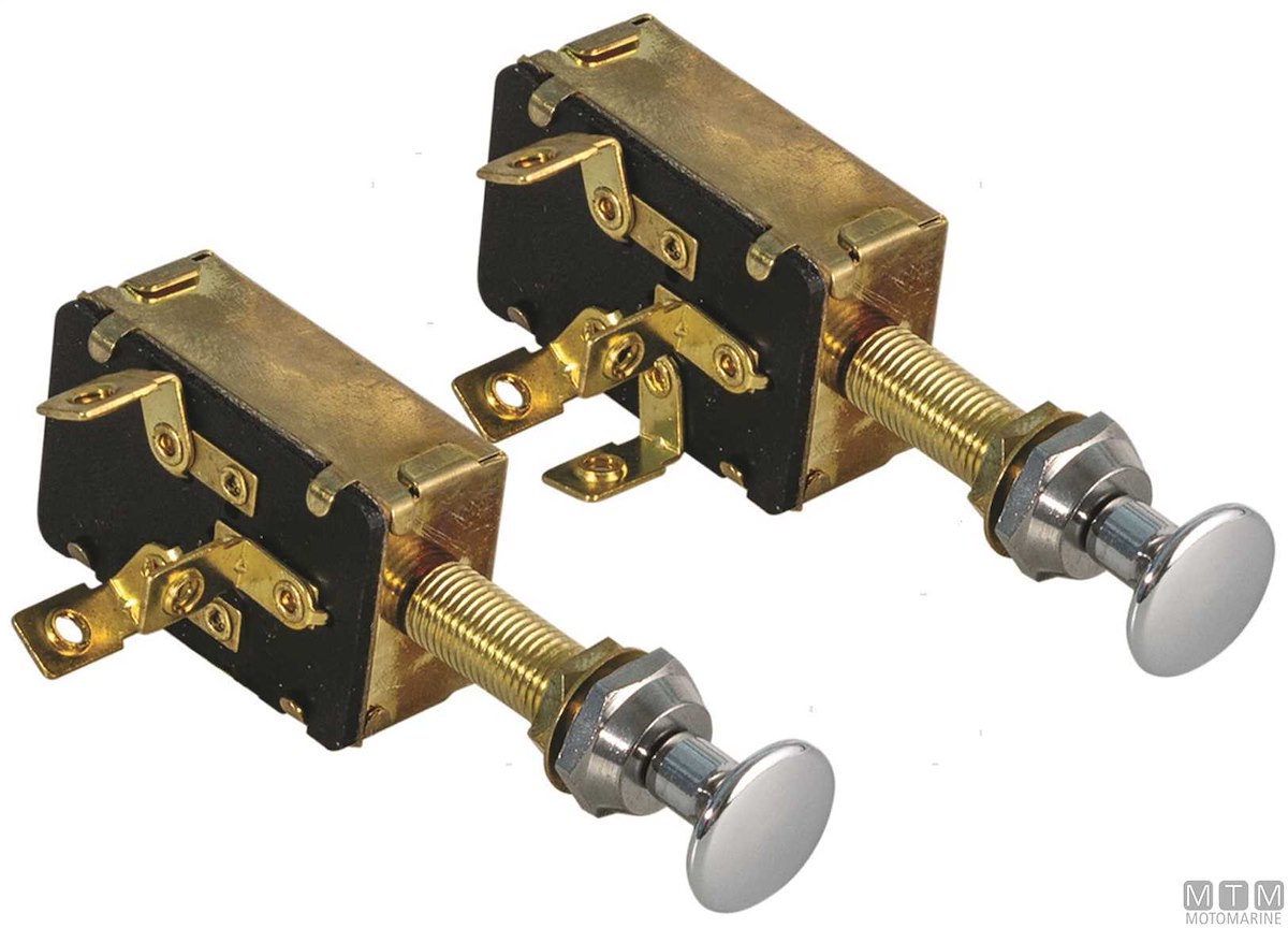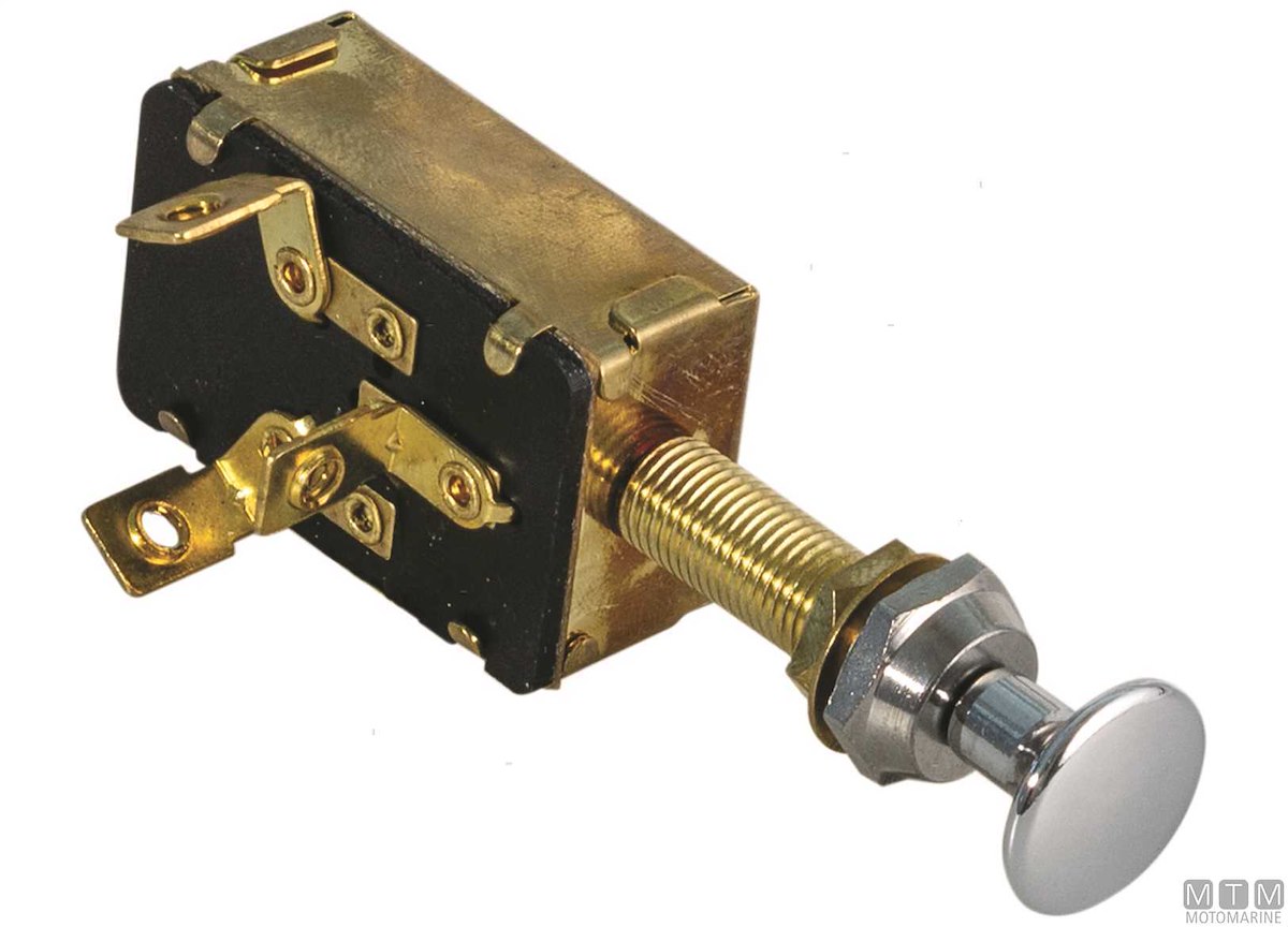 Interruttore con corpo in Ottone e pulsante a tiretto in Ottone Cromato. Per 2 circuiti. Foro da 9 mm.