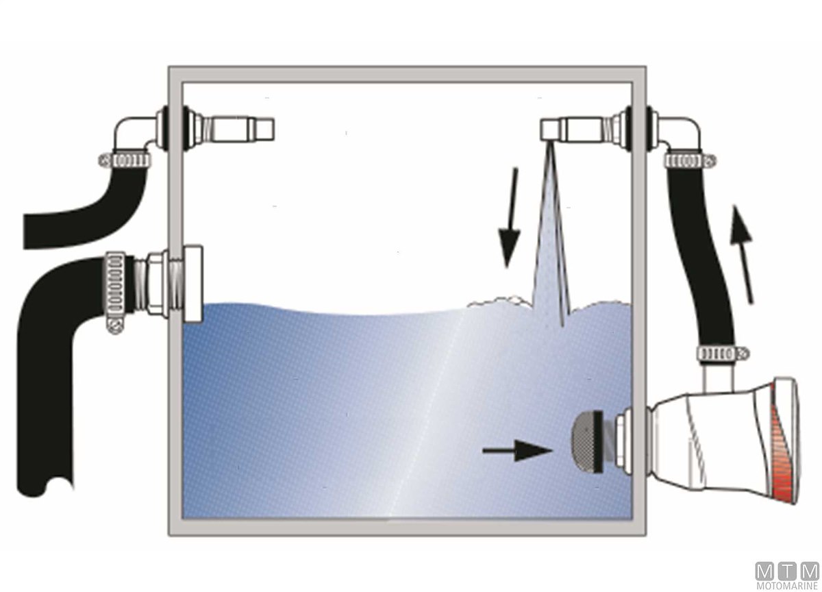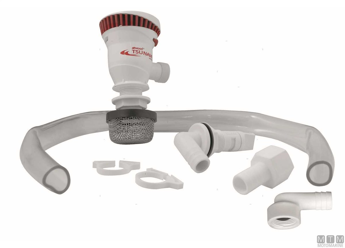 Kit di ossigenazione Attwood Tsunami Recirq che consente la circolazione forzata e l'ossigenazione autonoma dell'acqua nella vasca del pescato senza passascafo esterno. Comprende: