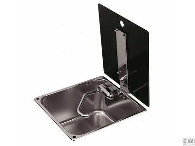Lavello quadro in Acciaio Inossidabile 18/8 con coperchio in vetro temperato. Completo di rubinetto pieghevole acqua fredda, da completare con piletta ø 50 mm.