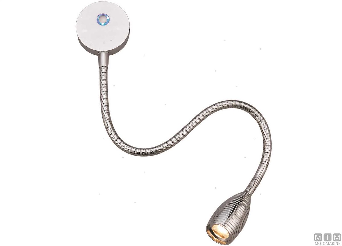 Luce da carteggio LED 10-30V con frusta in Alluminio Cromato, base 60 mm e interruttore dimmer touch. Luce bianca calda 3000°K, consumo 3W
