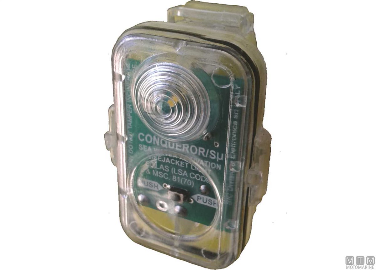 Luce di soccorso intermittente LED stagna con clip di aggancio per cinture e giubbotti di salvataggio. Accensione automatica salina con autonomia di 30 ore. Batterie incluse con 5 anni di durata. A norme Solas/MED, regolamentare per diporto e marina mercantile.