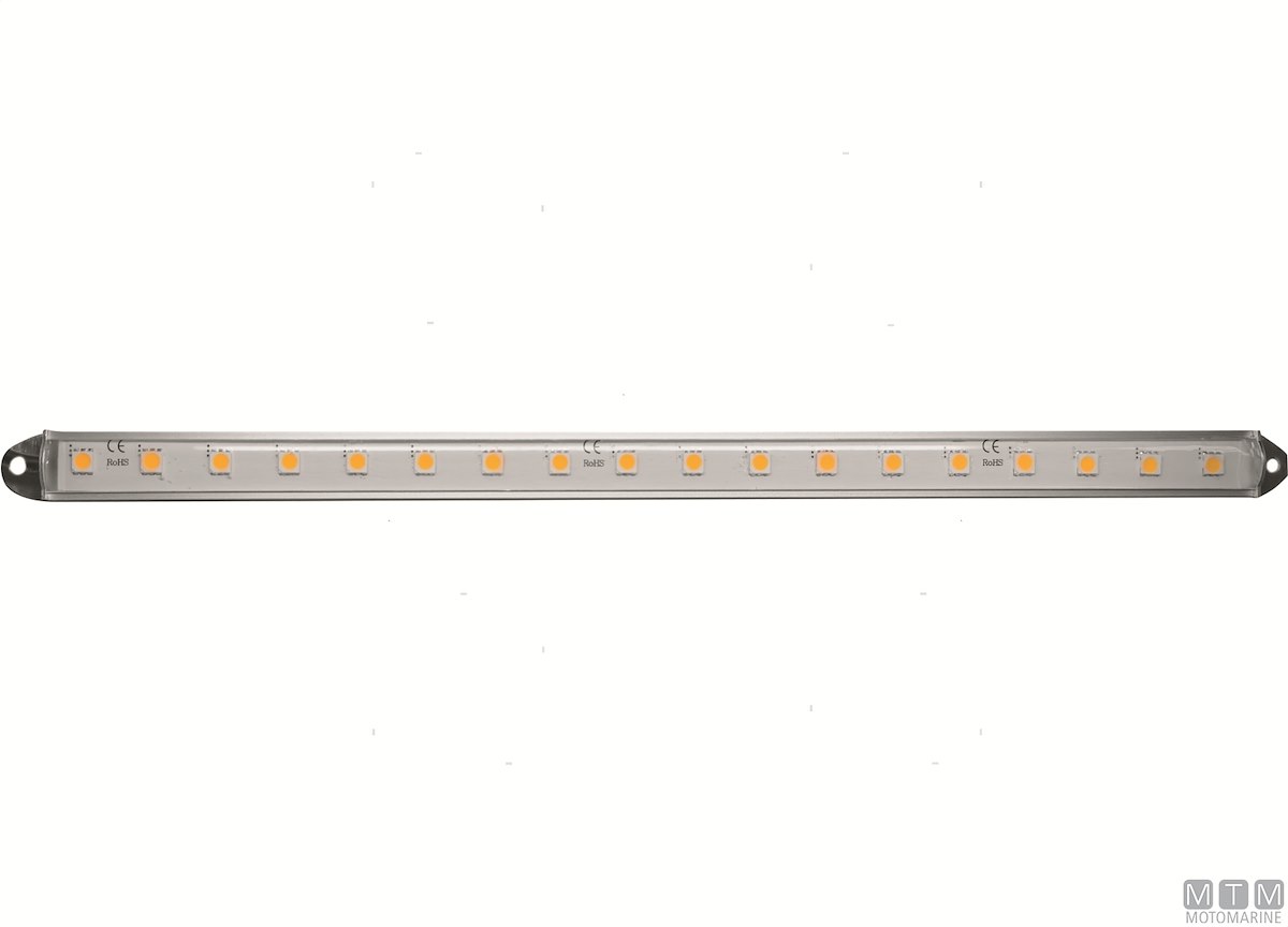Luce LED 12V in Alluminio impermeabile IP67 con montaggio a superficie.Luce bianca calda, consumo 3WDimensioni 300 x 16 x H10 mm