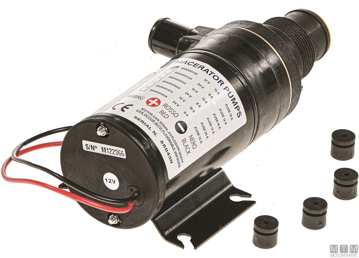 Pompa-Maceratore Ocean con testa in Polimero Termoindurente ideale per lo scarico di serbatoi e servizi igienici. Autoadescante fino a 2 metri, prevalenza fino a 5 metri. Dotato di lama rotante trita rifiuti che agevola il passaggio delle acque nere fino al serbatoio di raccolta. Attenzione: il maceratore deve essere montato quanto più vicino allo scarico del serbatoio. Entrata ø 38 mm / uscita ø 25 mm.
