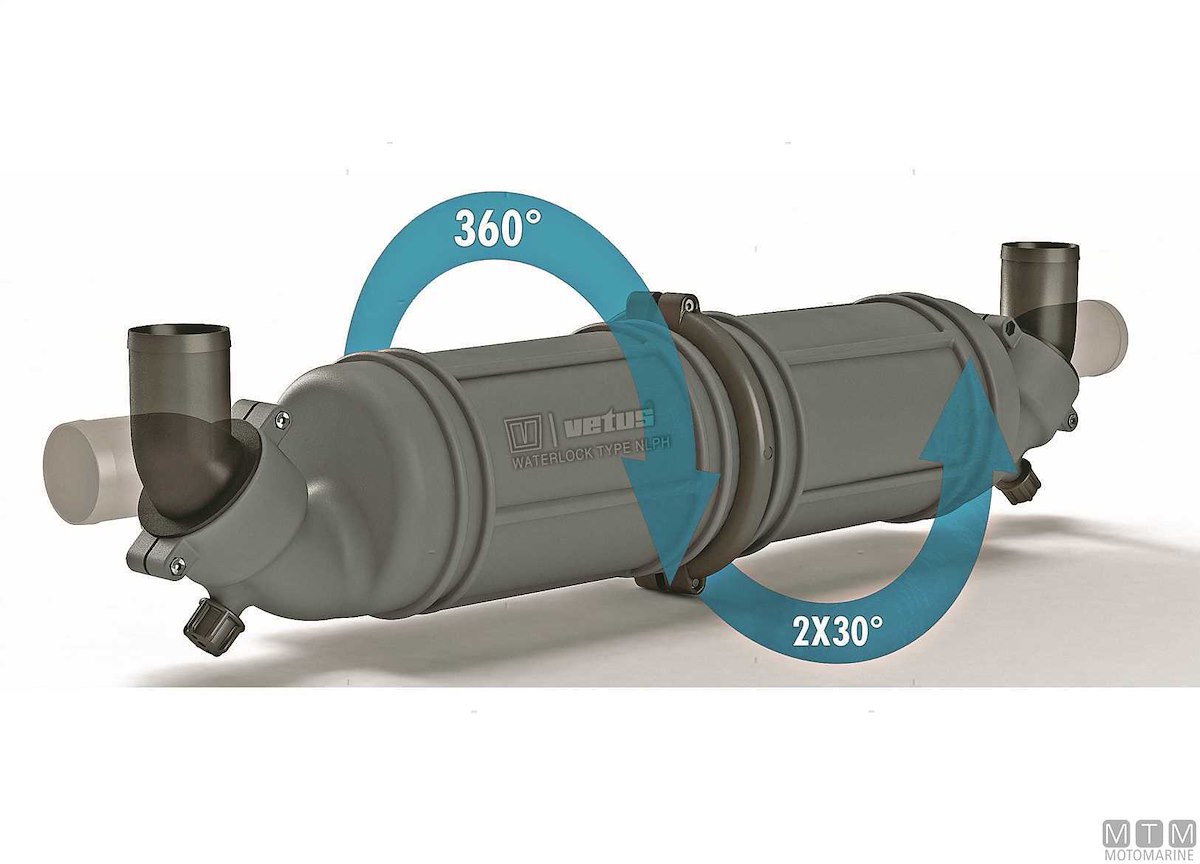 Marmitta / Silenziatore Vetus NLPH a installazione orizzontale con corpi e raccordi rotanti. La doppia camera abbatte drasticamente il livello del rumore.