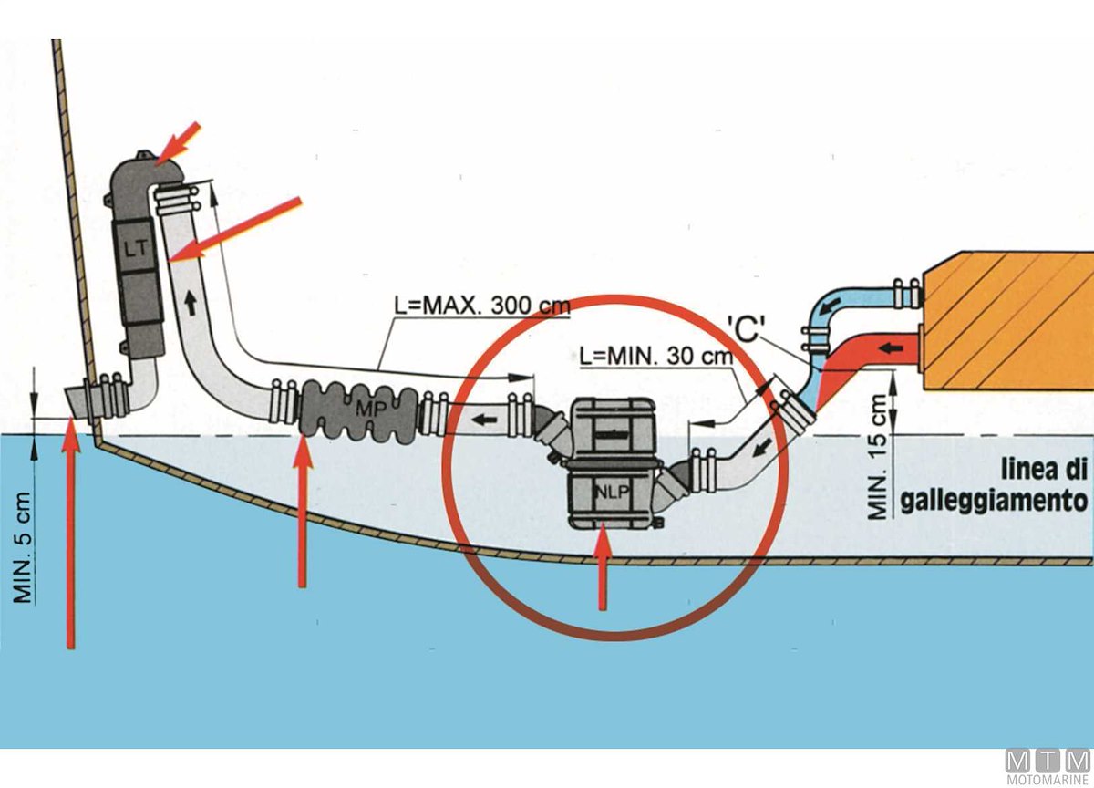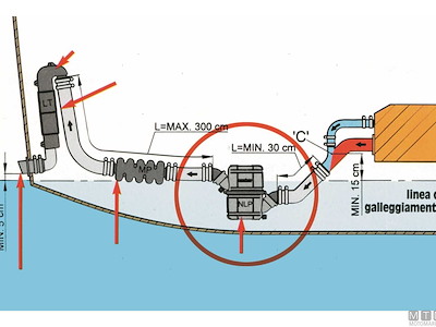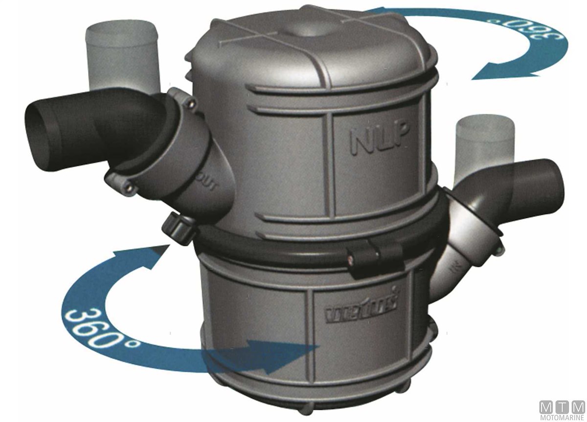 Marmitta silenziatore in materiale plastico rinforzato con raccordi girevoli. Compatta, può essere montata in luoghi angusti. Si installa su sistemi di scarico raffreddati ad acqua. Capacità: