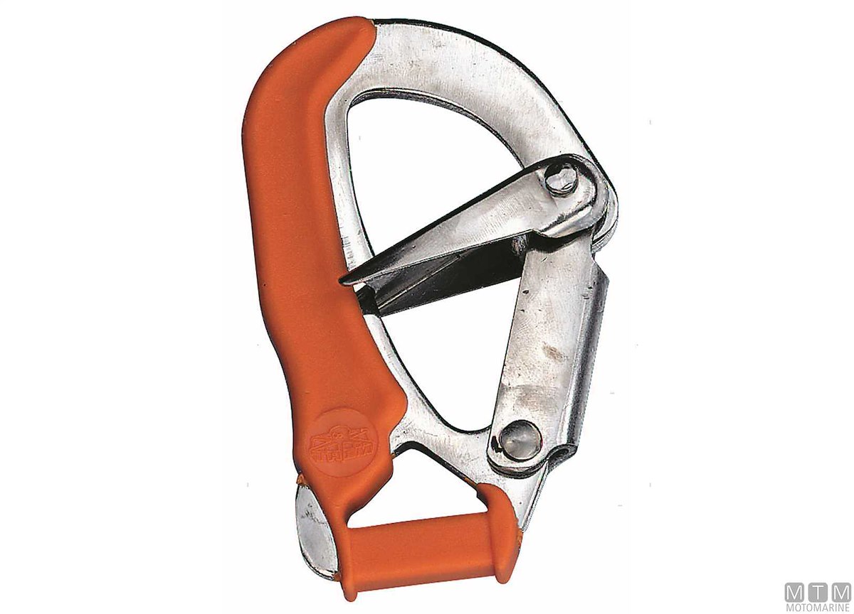 Moschettone di sicurezza con passa-cinghia per cinture di sicurezza e imbracature su barche a vela. Completo di sicura di blocco e difese in composito. Costruzione robustissima in Acciaio Inox AISI 316.