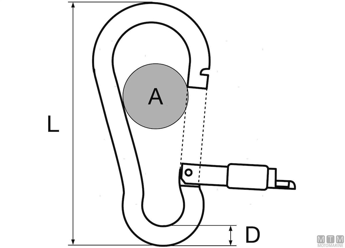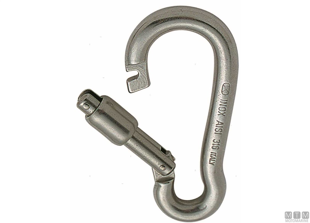 Moschettone in Acciaio Inox AISI 316 con apertura in fuori e ghiera di sicurezza. Sistema di aggancio antigrip. Non impiglia le cime.