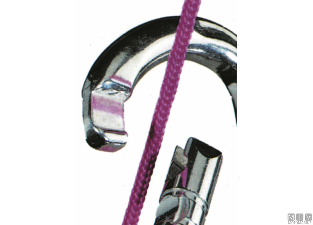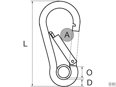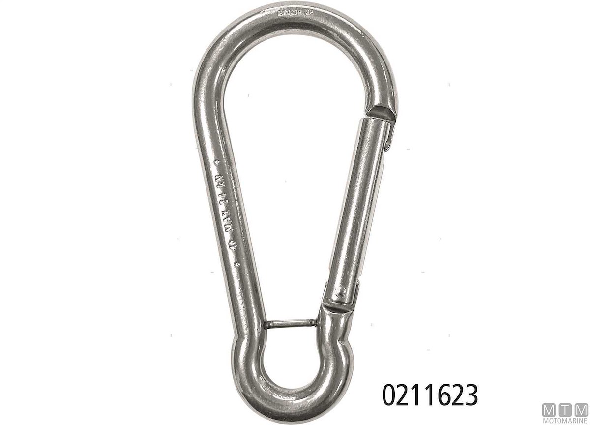Moschettone in Acciaio Inox AISI 316 con occhio e sistema di aggancio antigrip che non impiglia le cime. Il 0211623 ha una barra al posto dell'occhio.