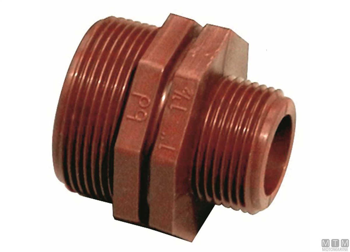Nipple ridotto filettato in Polipropilene Tech-Hi. Raccordi in Polipropilene atossico per impianti di bordo. Durevoli, robusti e leggeri, possono sostituire raccordi in metallo. Resistenti a torsioni, abrasioni, elettrolisi e agenti chimici.