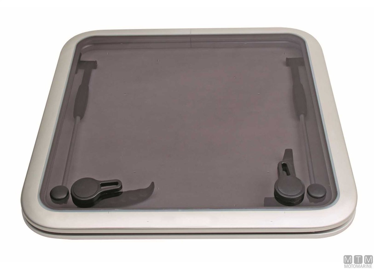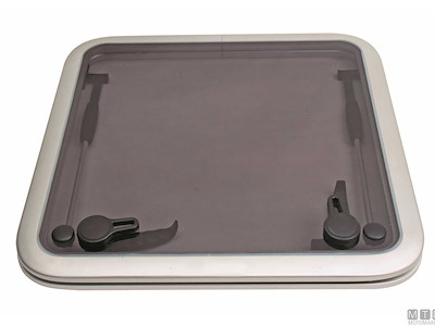 Osteriggio Goiot type quadrato con cornice in Alluminio Anodizzato satinato. Vetro colore fumè chiaro in Metacrilato spessore 10 mm. Guarnizione e maniglie livellate per una chiusura a tenuta stagna.