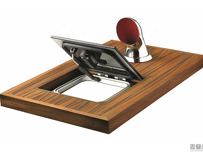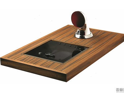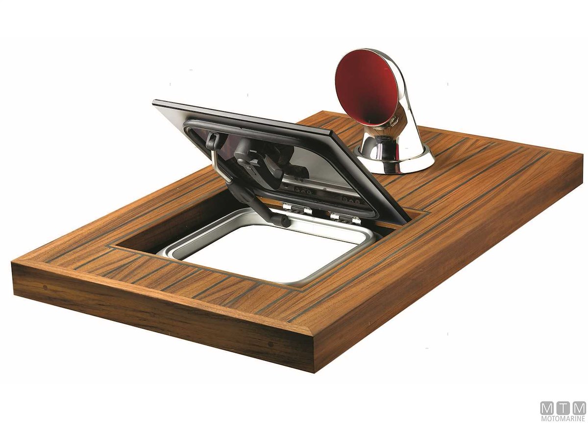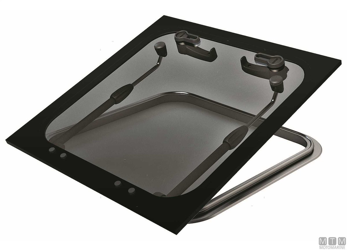 Osteriggio a filo ponte Vetus con cornice in Alluminio Anodizzato certificato CE classe AII. Completamente integrato nel ponte, non sono visibili parti sporgenti. Vetro colore fumè scuro in Acrilico di spessore 10mm.