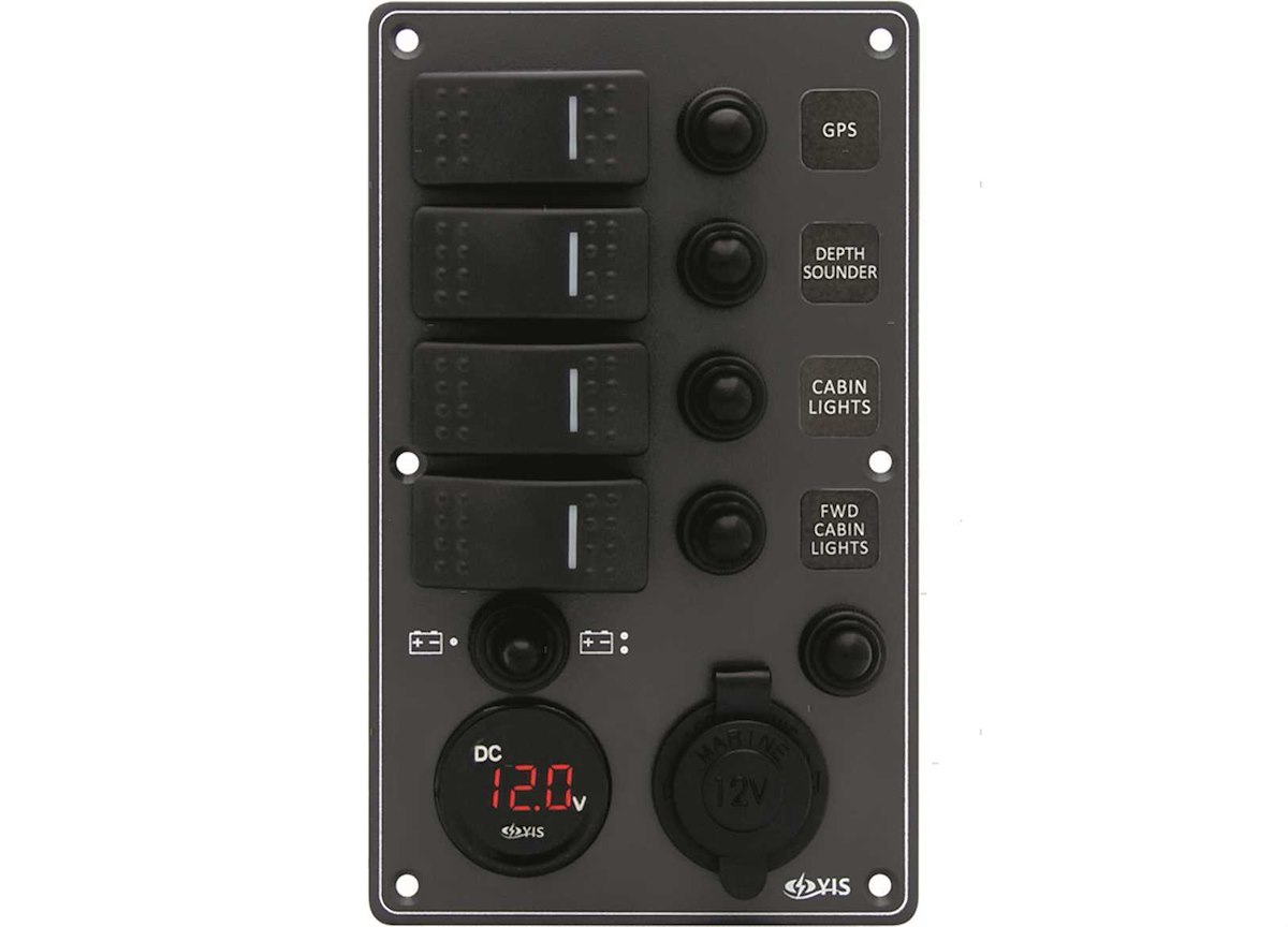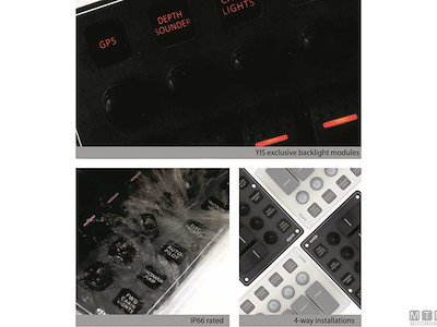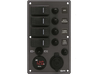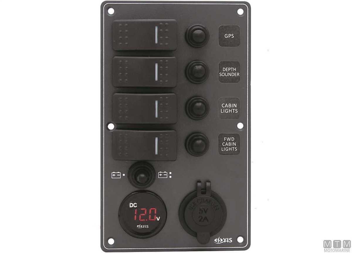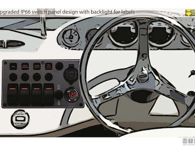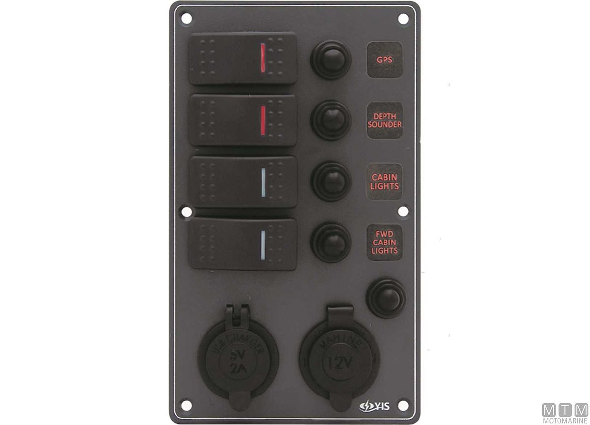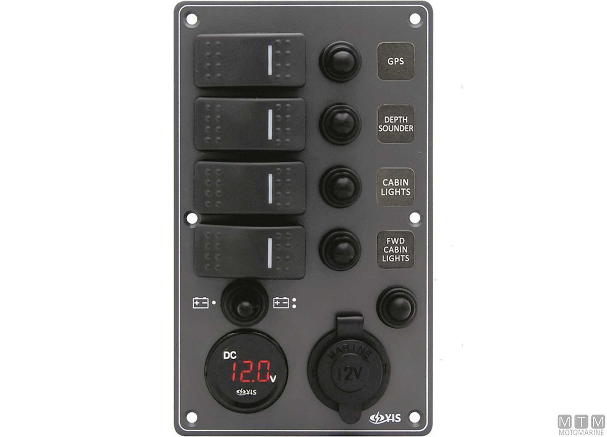 Pannelli 12/24V di qualità superiore in Alluminio compatti e impermeabili IP66. Precablati, con interruttori impermeabili dotati di spie LED rosse e valvole automatiche reinseribili con cappuccio di protezione. Il primo interruttore è (ON)-OFF per segnalazione acustica. Compresi di 30 etichette prestampate da applicare negli alloggi retroilluminati LED. Montaggio verticale oppure orizzontale.
