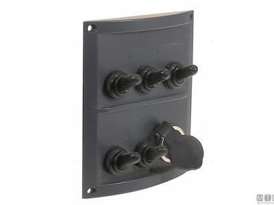 Pannello 12V in ABS nero con interruttori impermeabili e fusibili completo di etichette prestampate. Con presa 12V tipo accendino oppure USB entrambe con cappuccio stagno.
