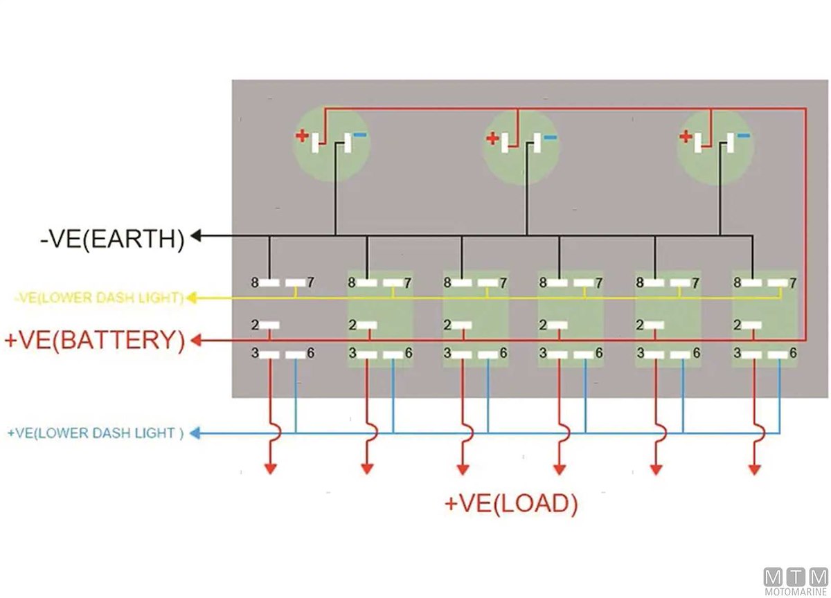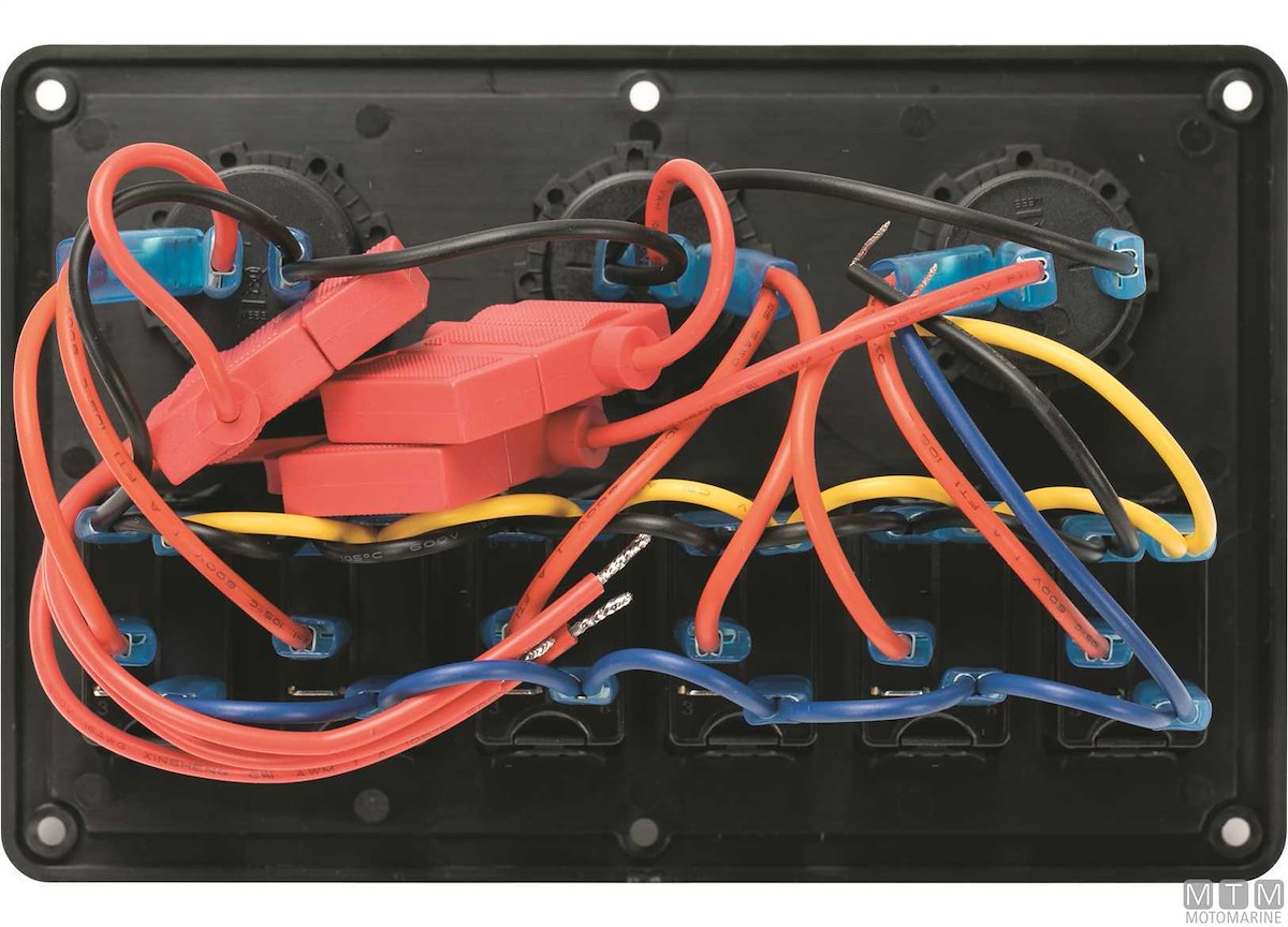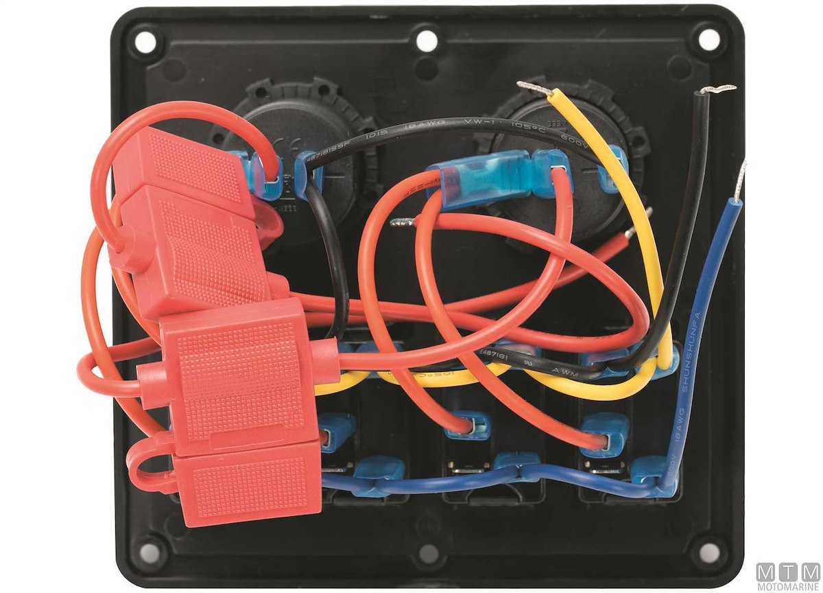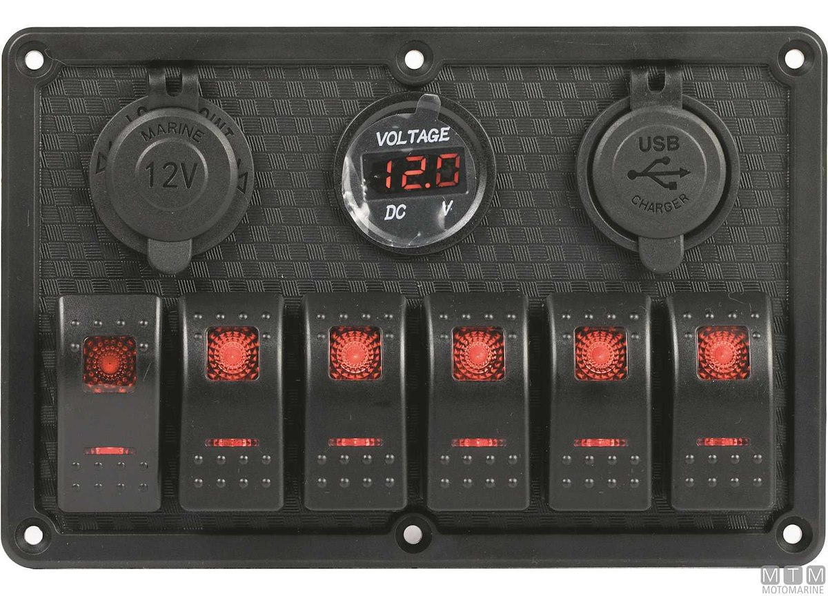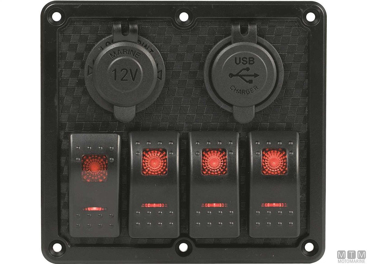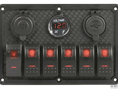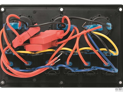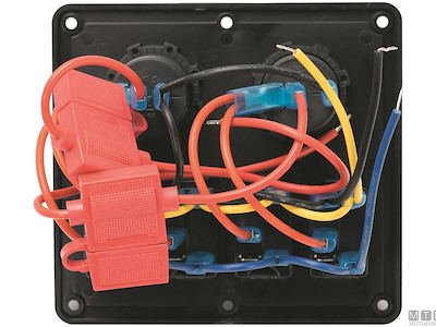Pannello in Polimero impermeabile IP65 con interruttori 12V-20A misura Carling con luce LED rossa e portafusibili. Il primo interruttore è (On)-Off per segnalazione acustica. Completo di viti montaggio e set etichette.