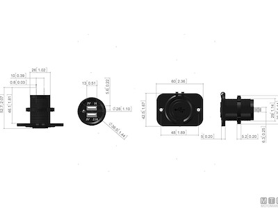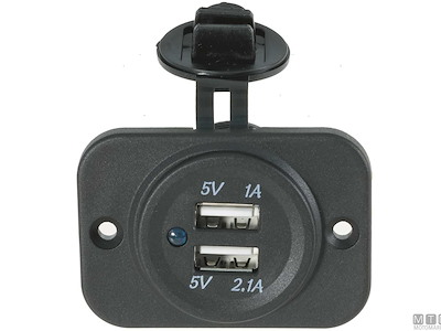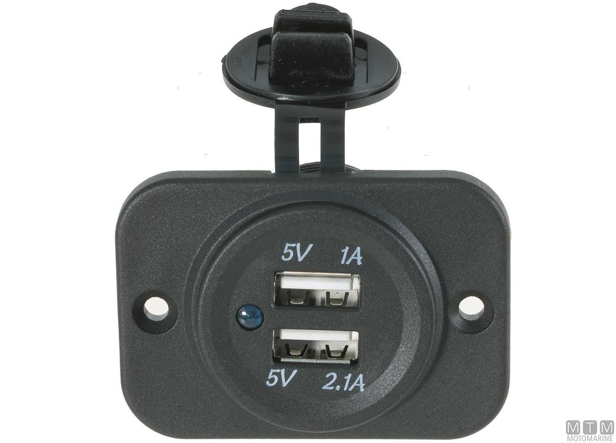 Pannello misura socket con doppia presa USB completo di cappuccio di protezione.