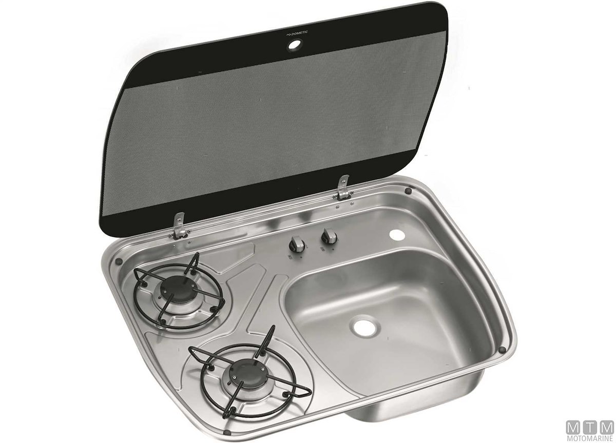Lavello-fornello compatto in Acciaio Inox satinato con coperchio in vetro, termosicurezze e piletta.