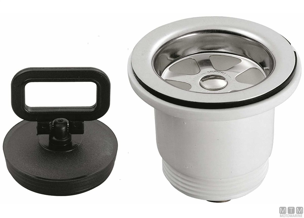 Piletta grande dritta per lavelli con foro 50 mm. Completa di tappo e uscita scarico lunga filettata.
