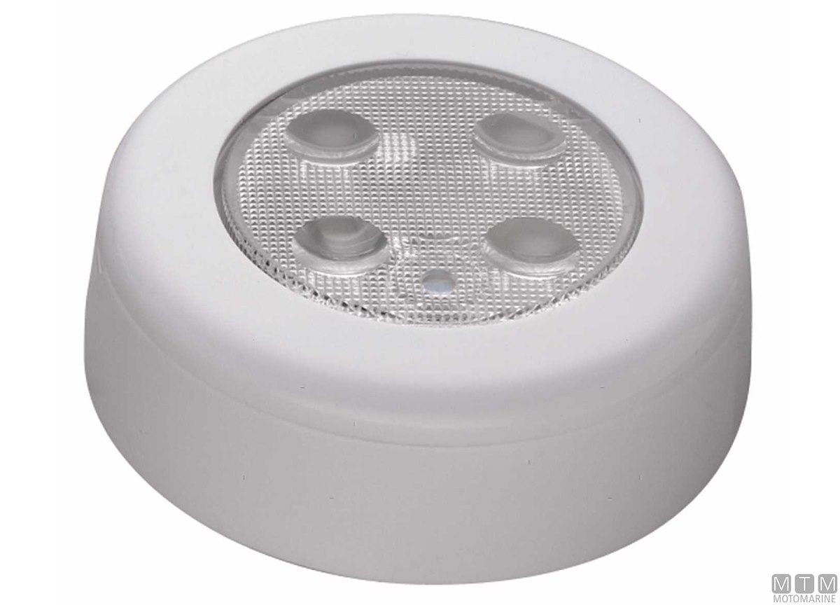 Plafoniera LED 12/24V con corpo in plastica bianca, si aziona premendo la lente.