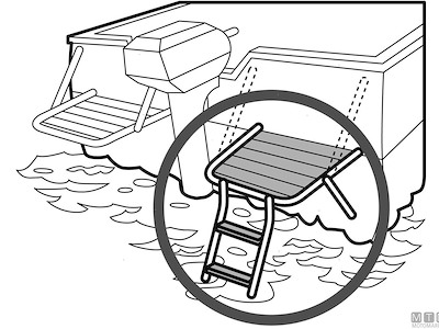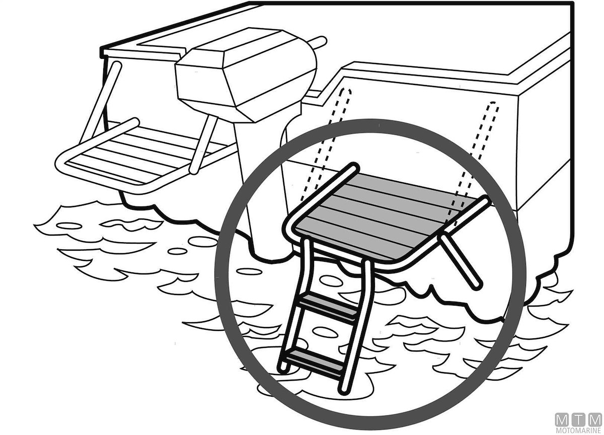 Plancetta di poppa in doghe di legno marino Doussie e telaio in Acciaio Inox AISI 316 con scaletta pieghevole a 3 gradini lunghezza 70 cm, larghezza 25 cm.