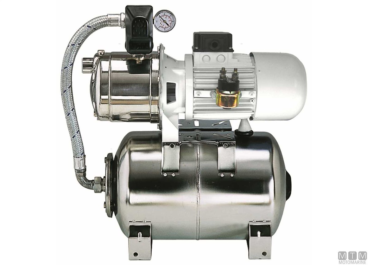 Gruppo pressione autoclave con serbatoio di espansione in Acciaio Inox per imbarcazioni da 18 a 35 m. Pompa in Acciaio Inox con girante in tecnopolimero Noryl.