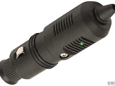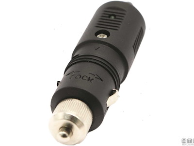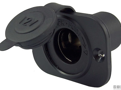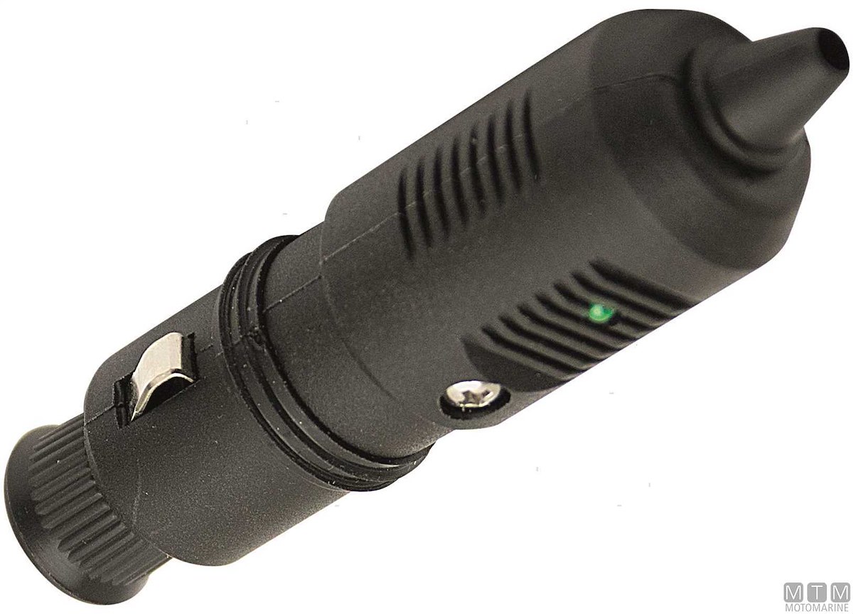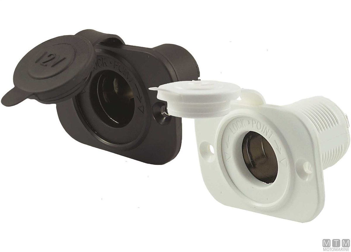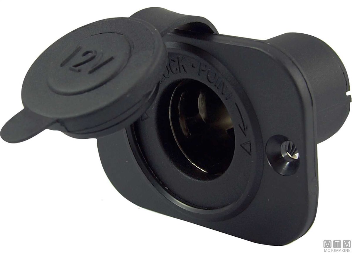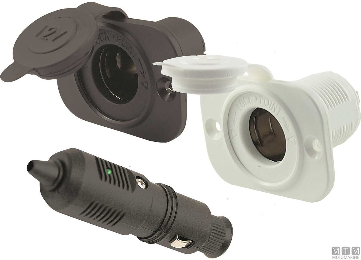 Presa e spina 12V tipo accendino impermeabile in Nylon rinforzato stabilizzato UV con sistema di blocco a rotazione e cappuccio stagno. Spina completa di LED e fusibile sostituibile. Dimensioni 50 x 60 x H43 mm.