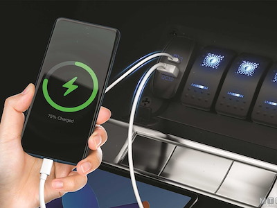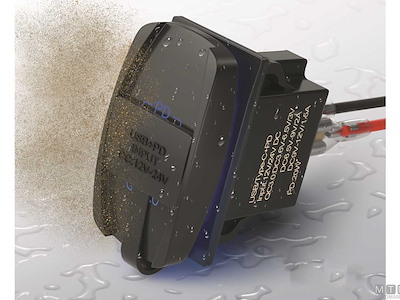 Presa USB 3.0A e Type-C impermeabile IP65 completa di luce LED blu e cappuccio di protezione. Grazie alle misure tipo Carling si inserisce alla perfezione su un qualsiasi pannello a interruttori.