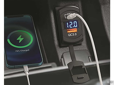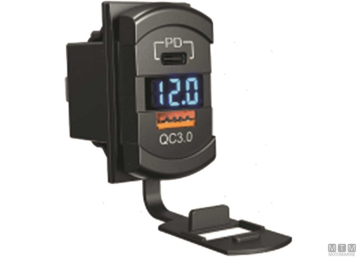 Presa USB 3.0A e Type-C impermeabile IP65 completa di voltmetro, luce LED blu e cappuccio di protezione. Grazie alle misure tipo Carling si inserisce alla perfezione su un qualsiasi pannello a interruttori.