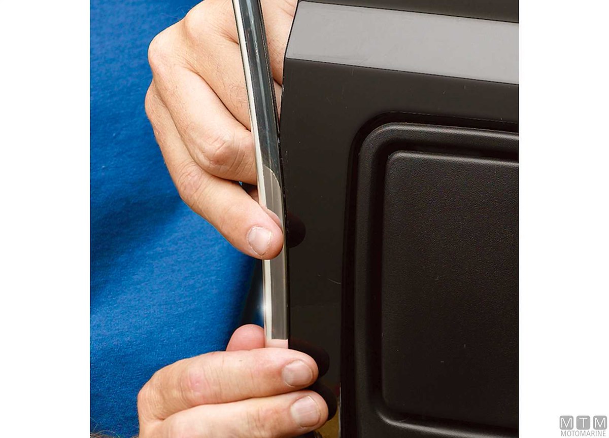 Profilo Trim-Lok per protezione e finitura di bordi, angoli, finestrini e parabrezza. Completo di adesivo sigillante prespalmato HM, si monta facilmente grazie alla struttura in PVC flessibile che si adatta alla forma del bordo. Confezione da 15 metri.