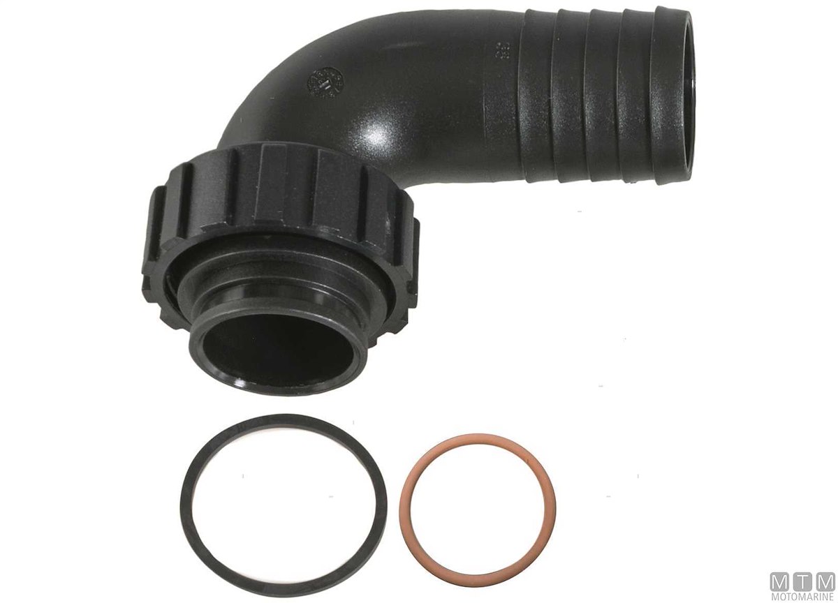 Raccordo portagomma angolato con attacco girevole per il carico di serbatoi acqua potabile. Completo di doppia guarnizione. Si monta sul boccaporto tramite la flangia filettata 1"1/2 femmina oppure su altre basi con filetto 1"1/2 maschio.