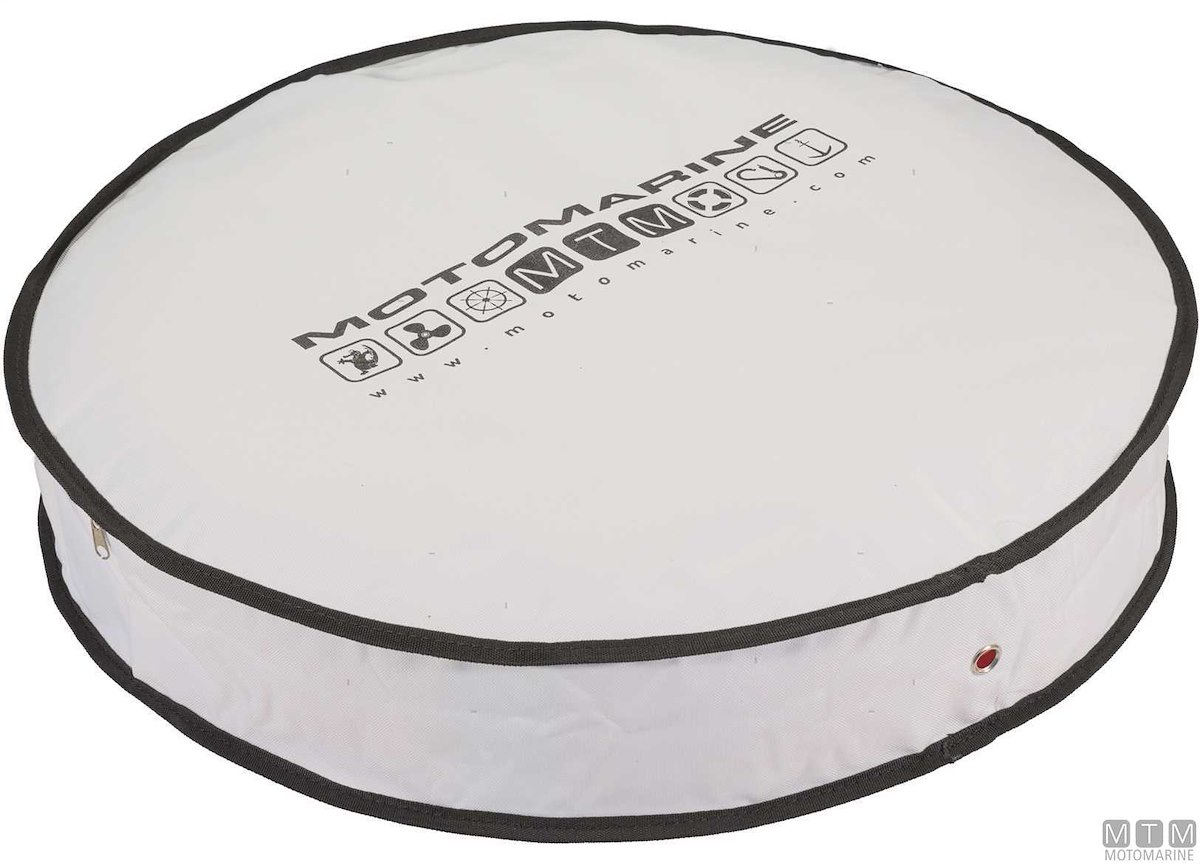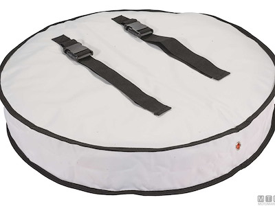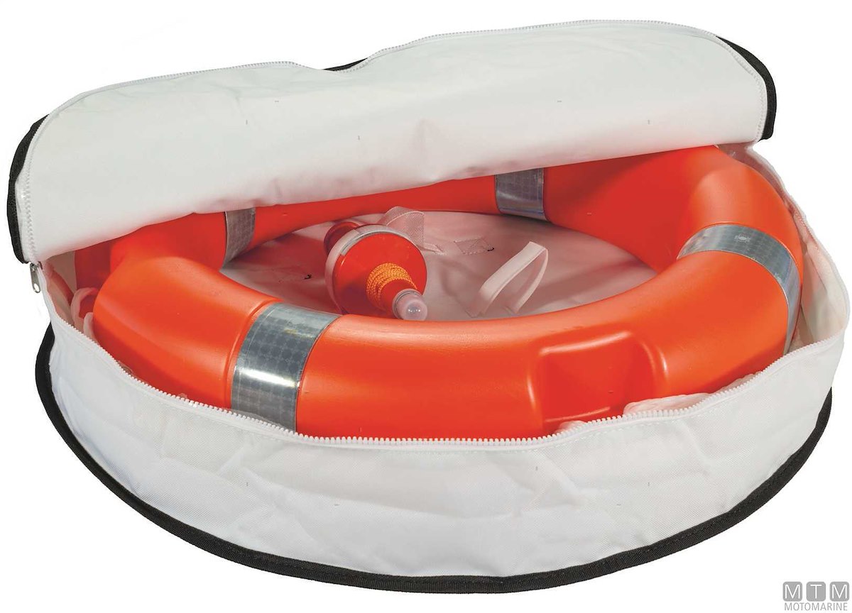 Sacca per salvagenti anulari in tessuto di poliestere imbottito con strato interno di PVC, cinghie di fissaggio regolabili e apertura a cerniera. Può contenere un salvagente anulare da 600 mm con boetta e sagola.