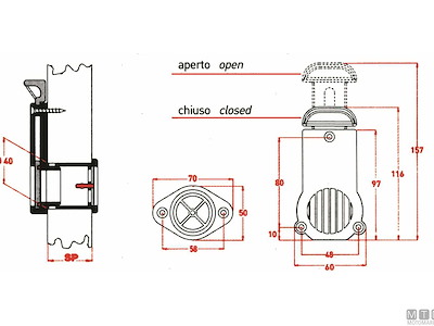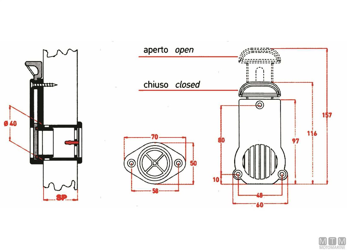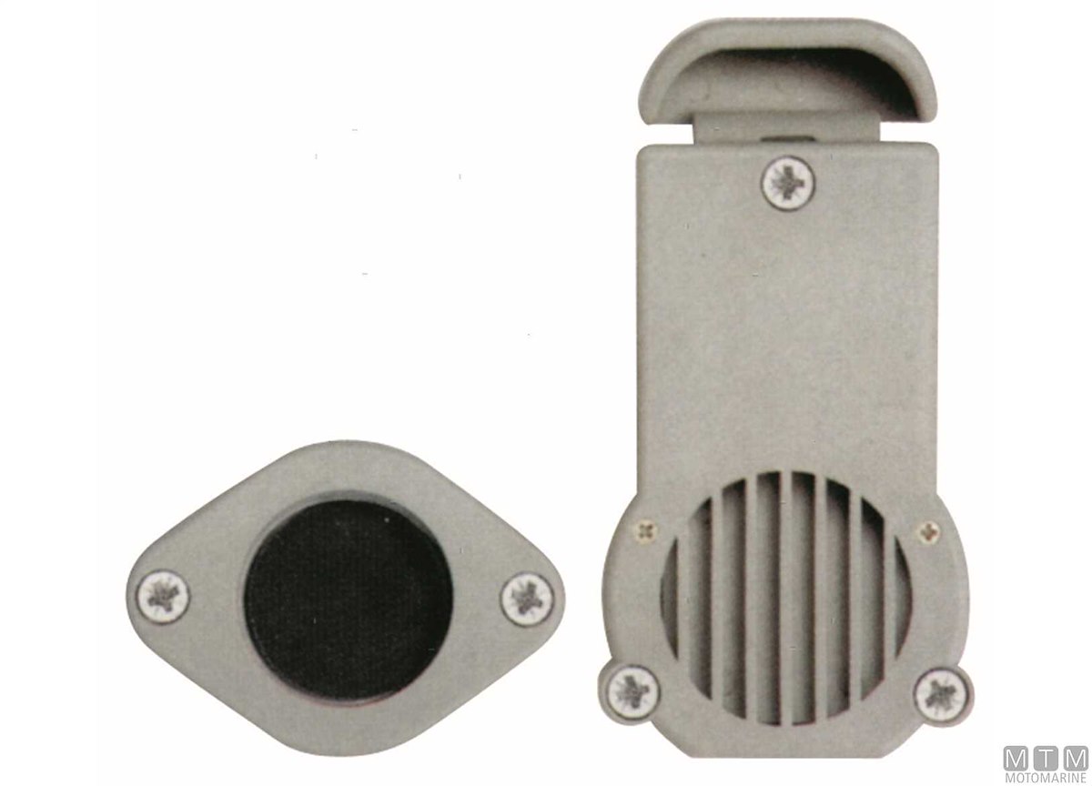 Scarico telescopico con membrana di non ritorno e saracinesca. In Nylon rinforzato, adatto a specchi di poppa di vari spessori.