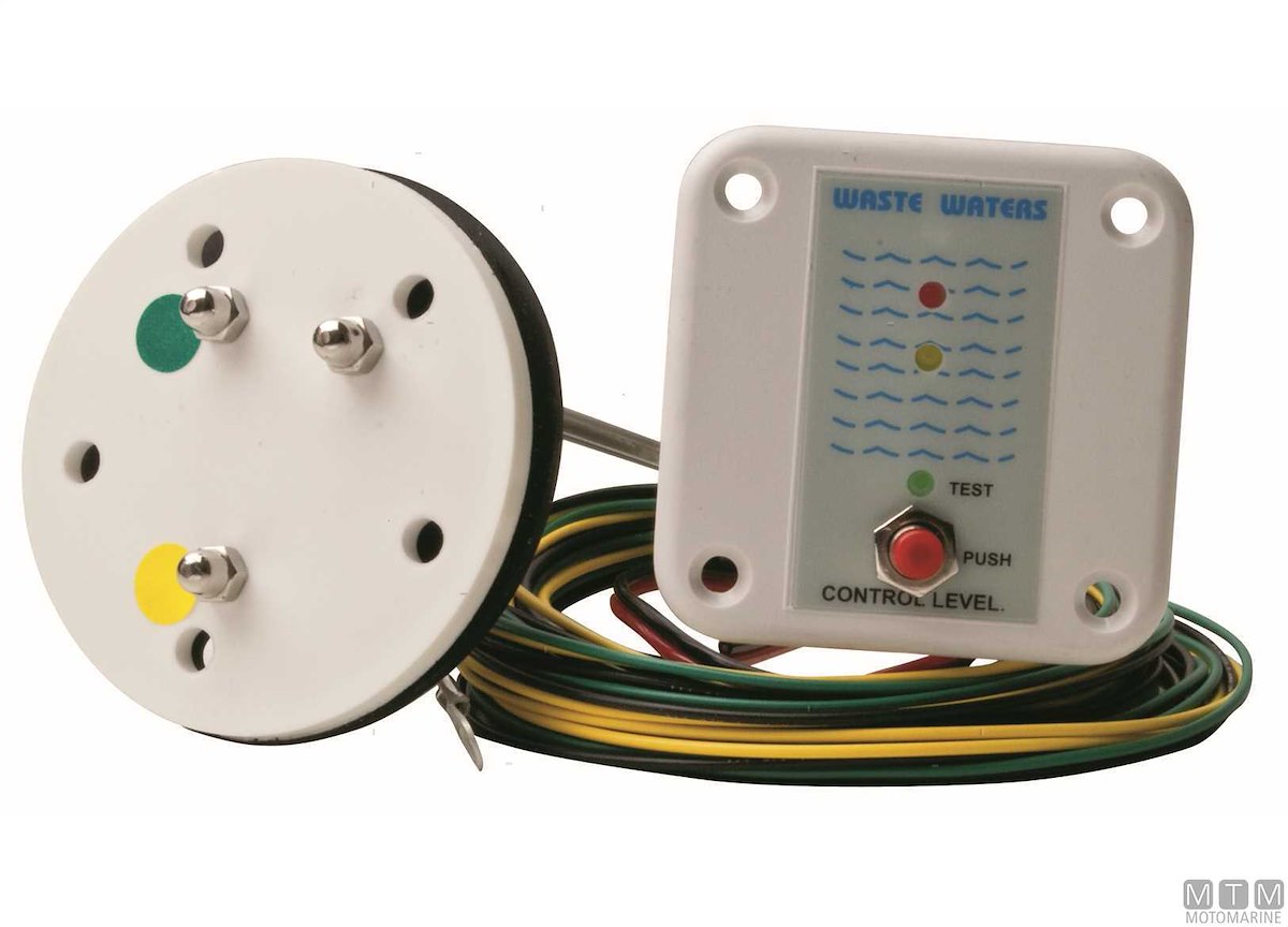 Pannello indicatore livello acque nere 12/24V. Sonda H13 cm con flangia universale tipo VDO a 5 fori.