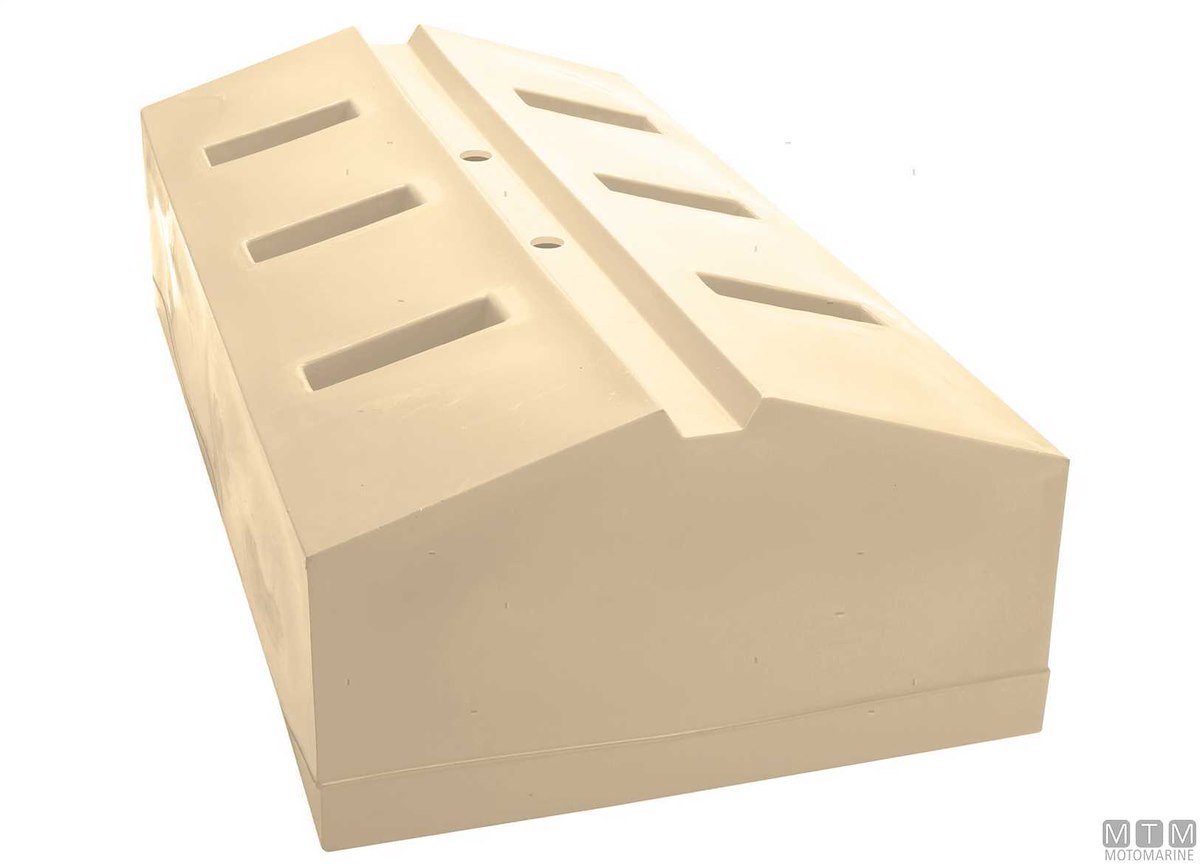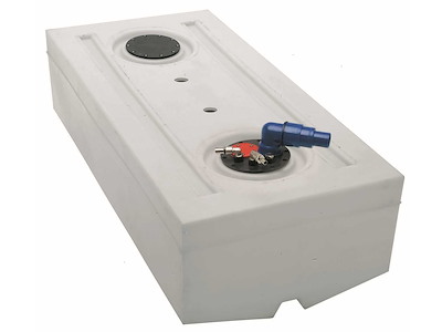 Serbatoio sagomato a fondo barca in Polietilene reticolato completo di boccaporto con sfiato da 17/19 mm, uscita con pescante da 12 mm e bocchettone di carico da 38/50/60 mm. Certificazione CE-ISO21487.