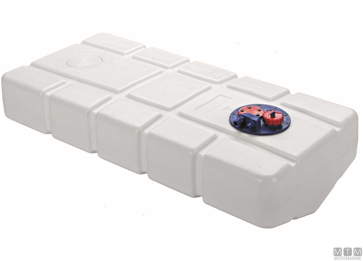 Serbatoio sagomato a fondo barca in Polietilene reticolato completo di boccaporto con sfiato da 17/19 mm, uscita con pescante da 12 mm e tappo filettato. Da completare con raccordo di carico 38/50/60 mm. Certificazione CE-ISO21487. Altezza raccordi boccaporto 85 mm.