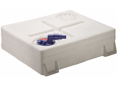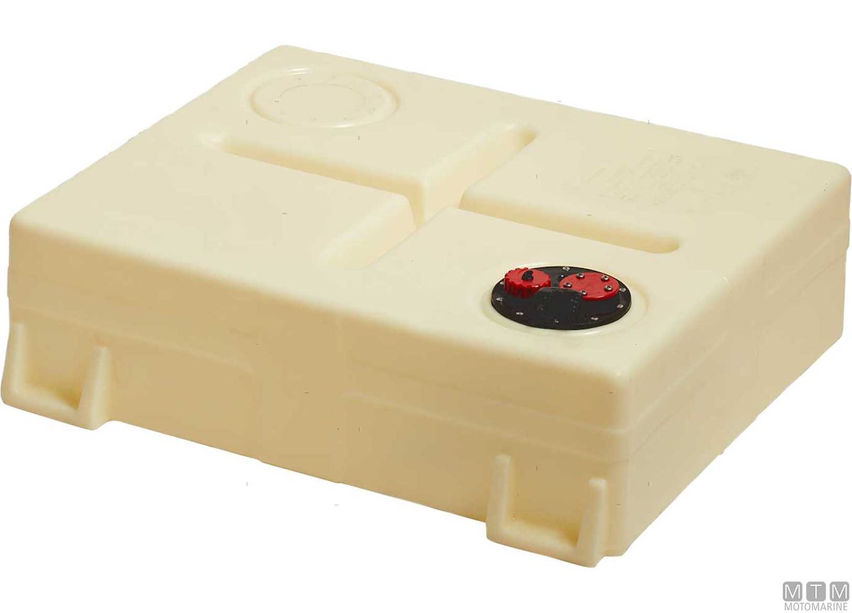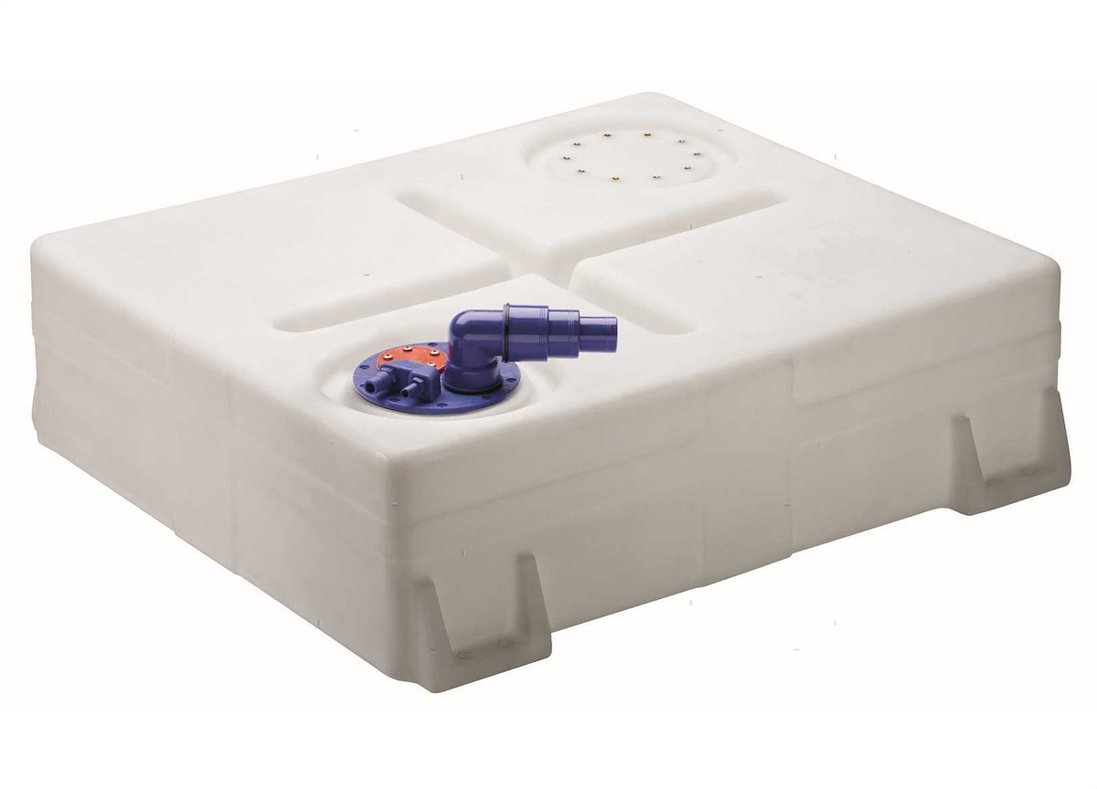 Serbatoio rettangolare in Polietilene reticolato completo di boccaporto con sfiato da 17/19 mm, uscita con pescante da 12 mm, da completare con raccordo di carico 38/50/60 mm. Certificazione CE-ISO21487. Altezza raccordi boccaporto 85 mm.