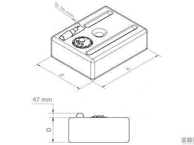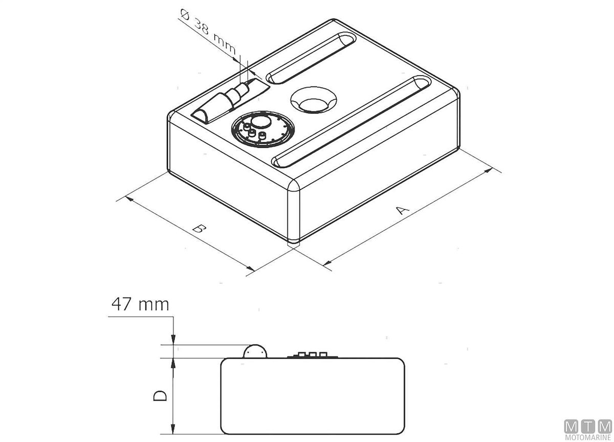 Serbatoio rettangolare in Polietilene reticolato con raccordi prestampati per primi impianti OEM. Completo di boccaporto con sfiato da 17/19 mm, uscita con pescante da 12 mm e tappo filettato. Certificazione RINa CE-ISO21487.