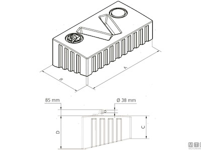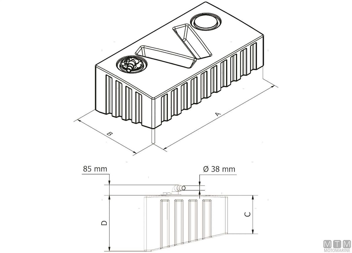 Serbatoio sagomato a posizione laterale fondo barca in Polietilene reticolato completo di boccaporto con sfiato da 17/19 mm, uscita con pescante da 12 mm e bocchettone di carico da 38/50/60 mm. Certificazione CE-ISO21487.