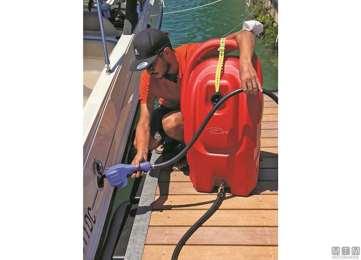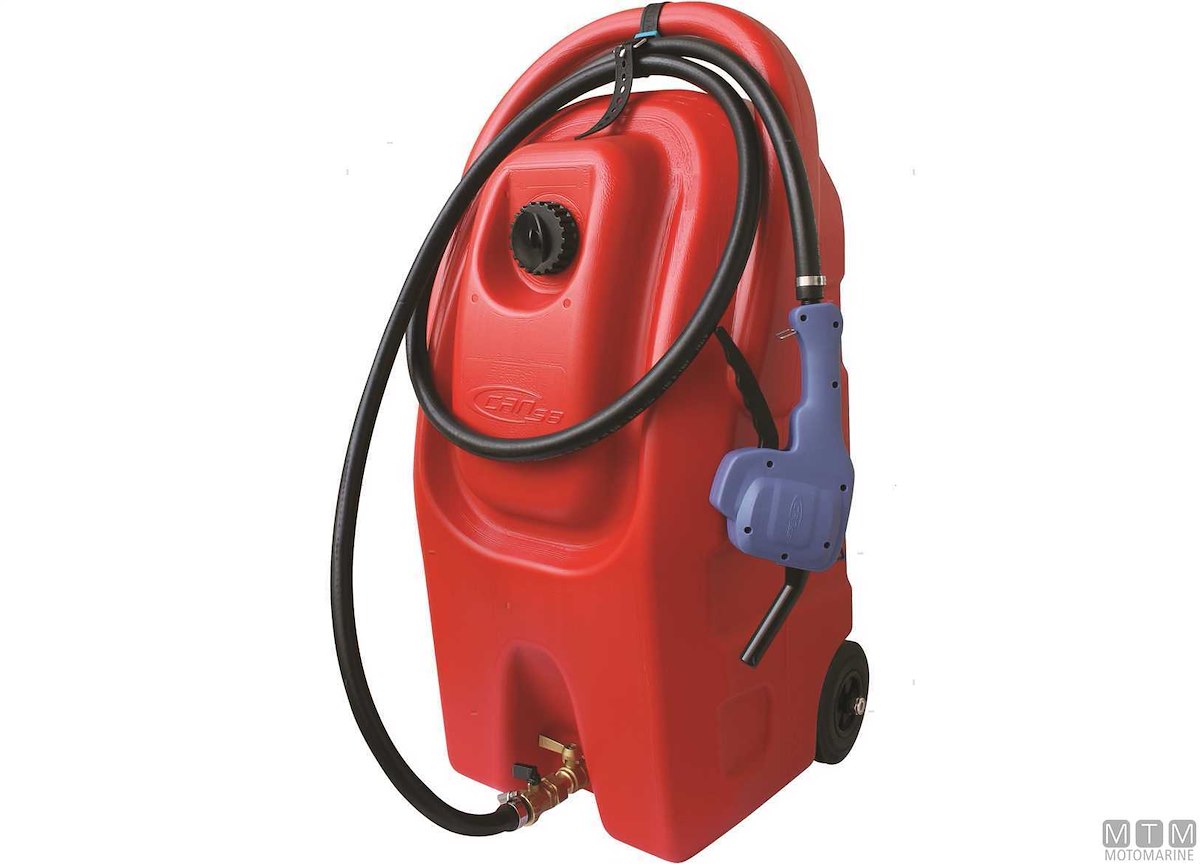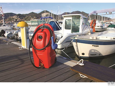 Serbatoio carburante di servizio su ruote. Completo di sfiato, valvola di blocco e tubo flessibile da 3 metri. La pistola erogatrice con portata di 8 Lt/min, grazie alla pompa manuale a pressione incorporata, consente sia il riempimento a caduta che in prevalenza verso l'alto. Omologato UN per trasporto su strada.