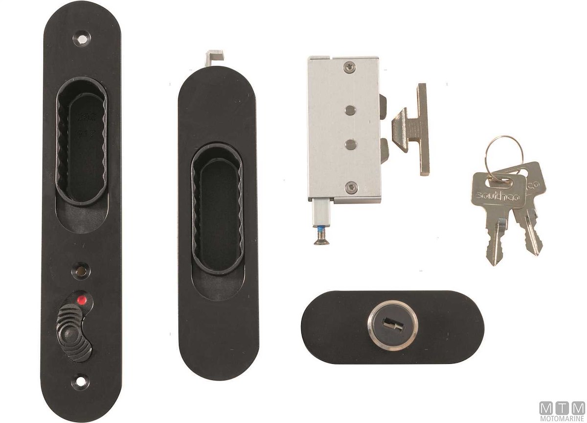 Serratura a incasso per porte scorrevoli di Alluminio, Vetroresina o Legno. Grande resistenza al salino e alla corrosione. Con meccanismo Positive-Grip che tiene le porte chiuse anche in condizioni estreme. Mano universale DX/SX.