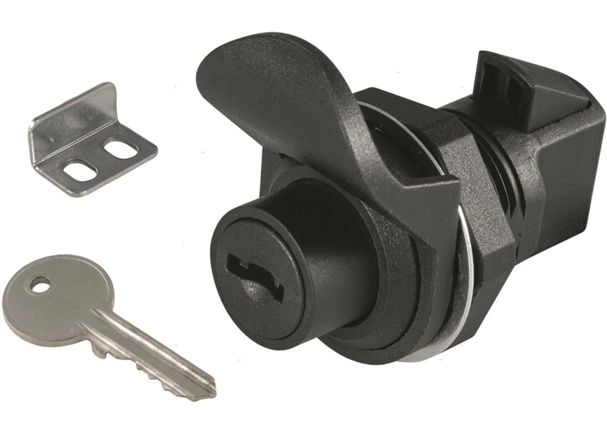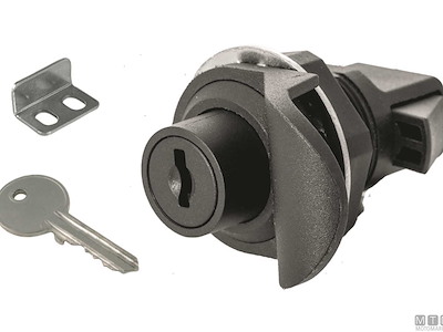 Serratura a pulsante in Nylon caricato con doppia chiave. Completa con rondella di fissaggio e scontro in Acciaio Inox.