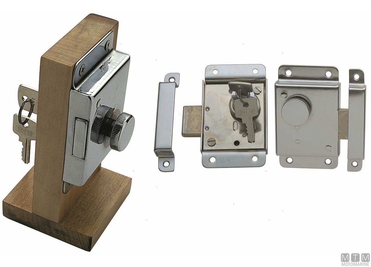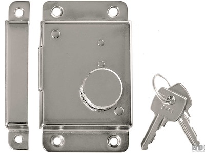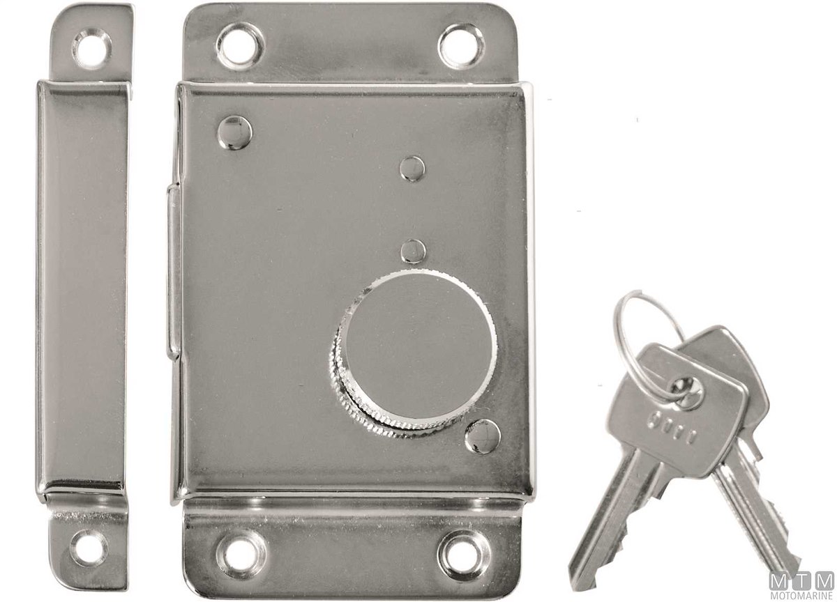 Serratura da accostare con chiavi, cilindro di sicurezza, scontro a cassetta e pomolo per aprire dall'interno. Corpo in Ottone Cromato e componenti inossidabili. Mano universale DX/SX.