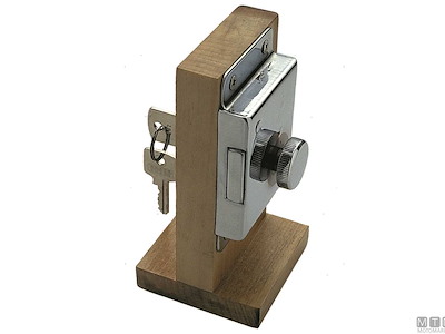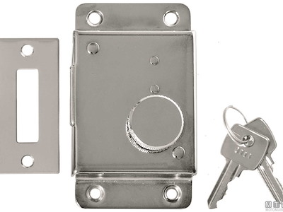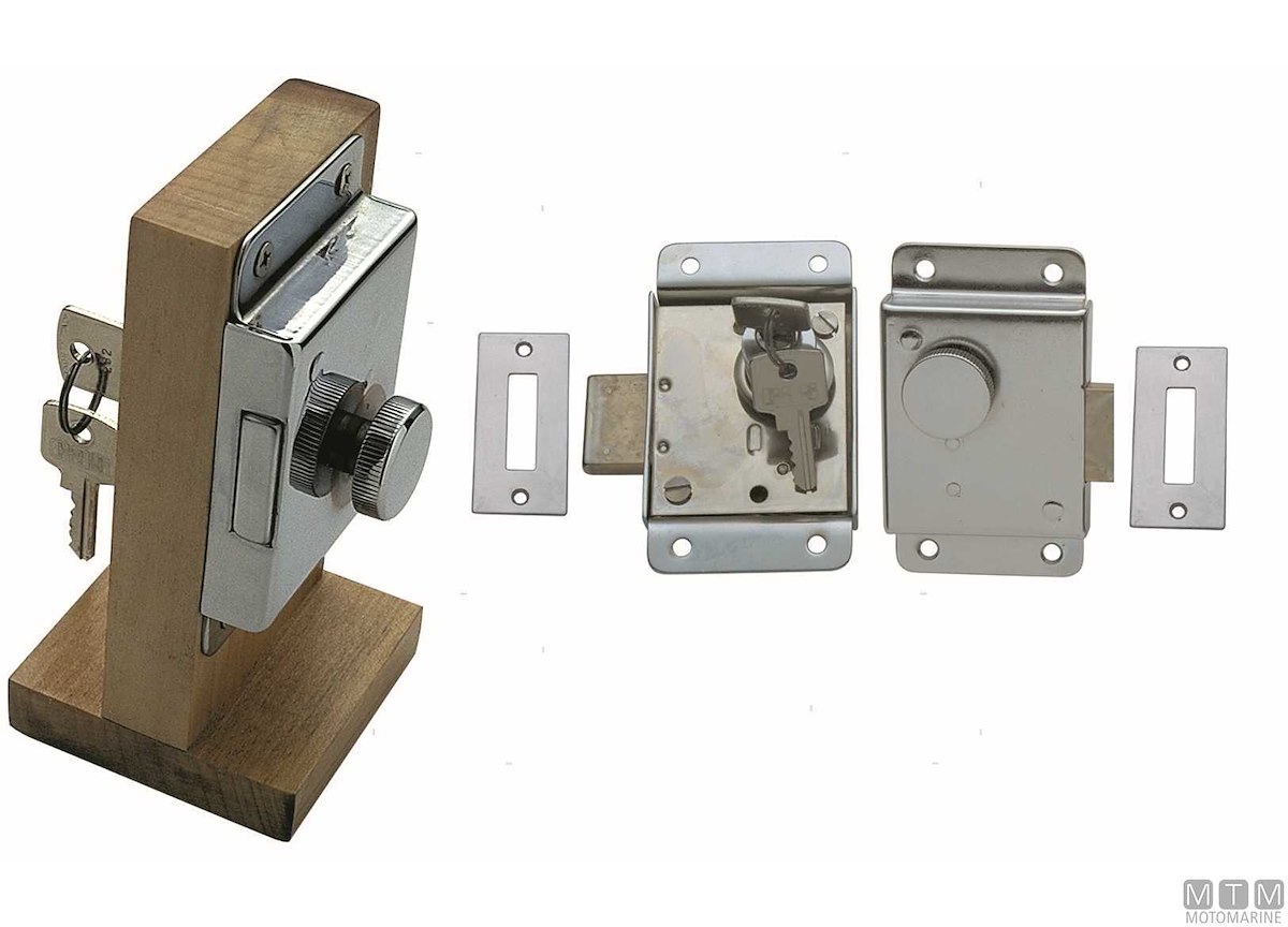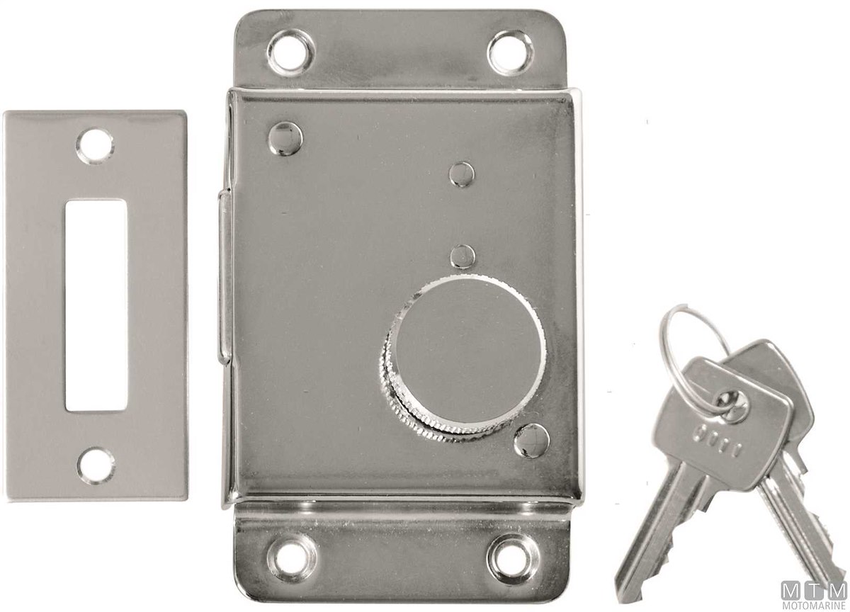 Serratura da accostare con chiavi, cilindro di sicurezza, scontro piano e pomolo per aprire dall'interno. Corpo in Ottone Cromato e componenti inossidabili. Mano universale DX/SX. Interasse fori 83 x 36 mm.