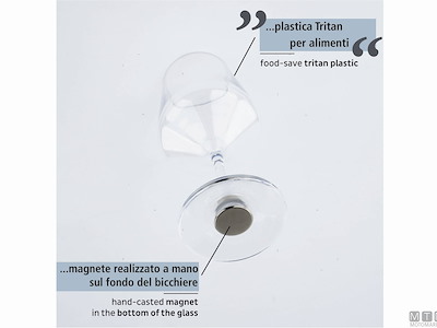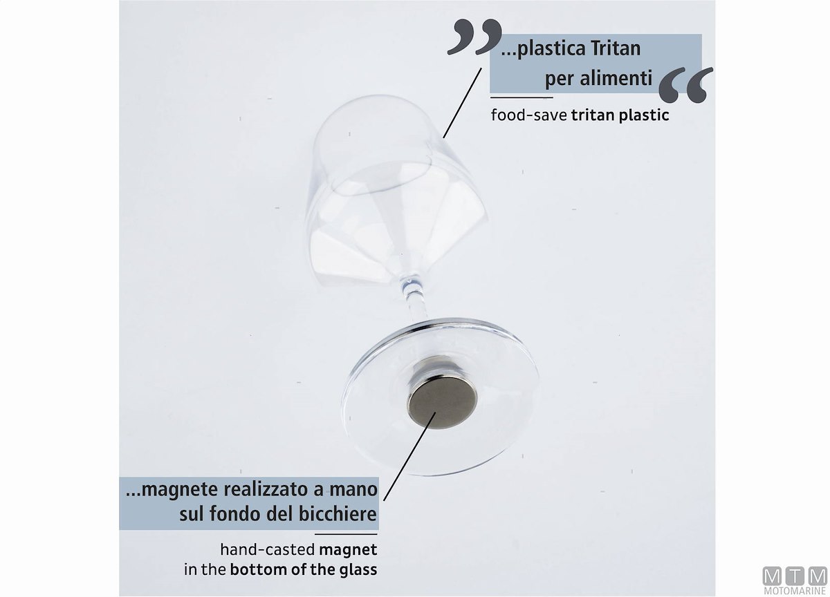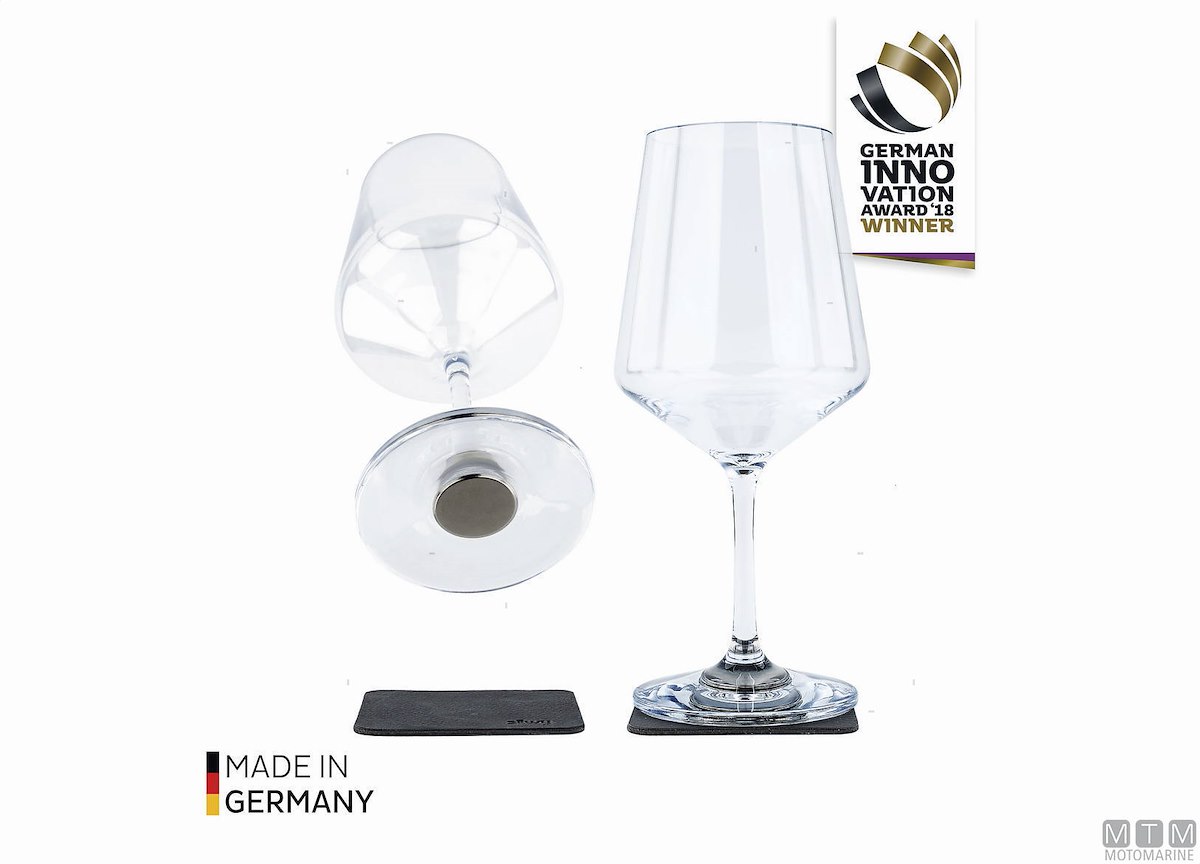 Eleganti calici da vino Silwy in plastica di alta qualità con pratici magneti integrati sul fondo che ne rendono sicuro l’appoggio anche quando il mare è mosso. Rapporto di tenuta perfetto tra sottobicchiere e bicchiere. I sottobicchieri metallici in nano-gel sono rimovibili, durevoli, non lasciano residui e aderiscono a tutte le superfici. Forniti in set da 2 bicchieri, compresi di sottobicchieri in nano-gel metallizzati.