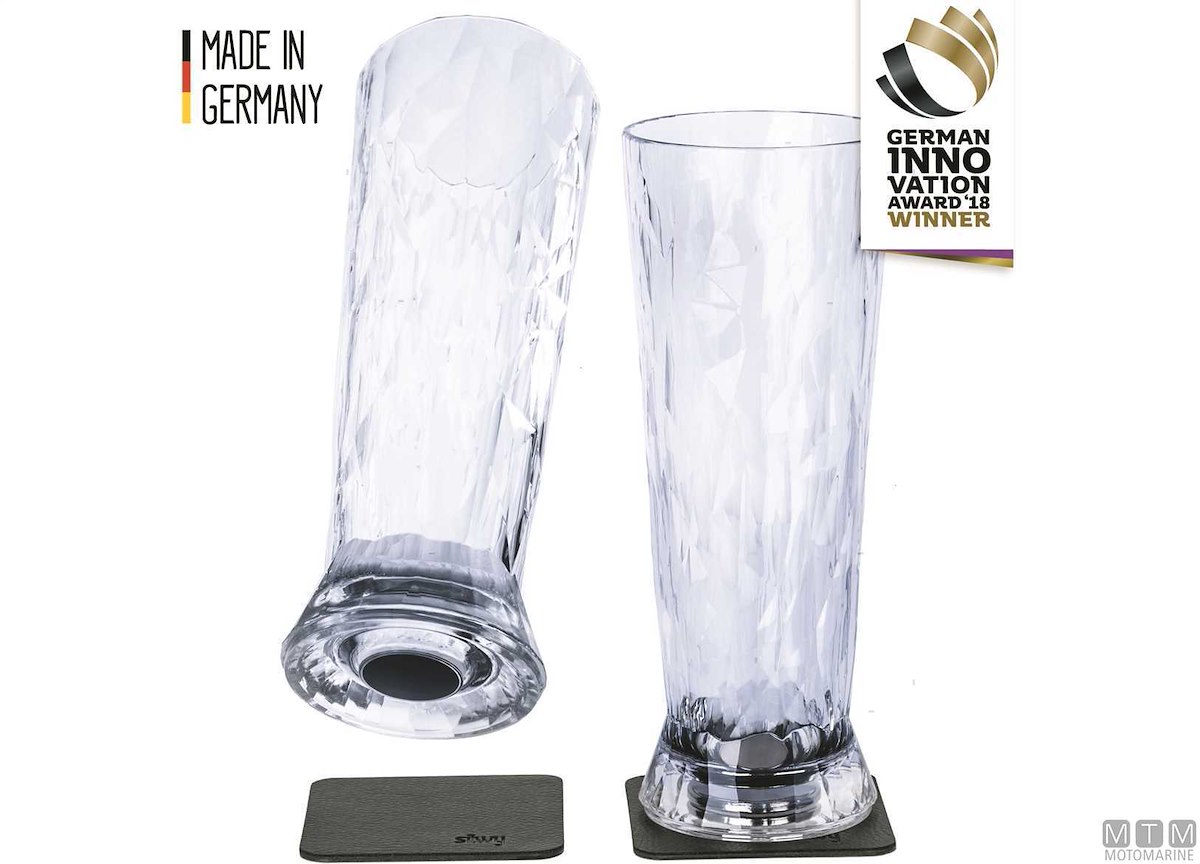 Eleganti calici da birra Silwy in plastica di alta qualità con pratici magneti integrati sul fondo che ne rendono sicuro l’appoggio anche quando il mare è mosso. Rapporto di tenuta perfetto tra sottobicchiere e bicchiere. I sottobicchieri metallici in nano-gel sono rimovibili, durevoli, non lasciano residui e aderiscono a tutte le superfici. Forniti in set da 2 bicchieri, compresi di sottobicchieri in nano-gel metallizzati.