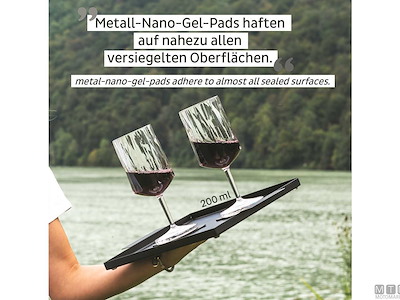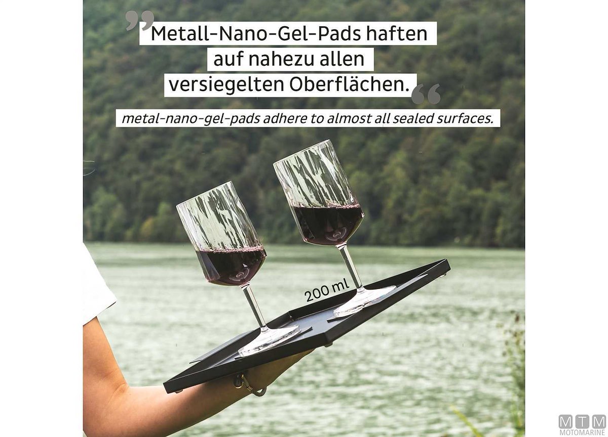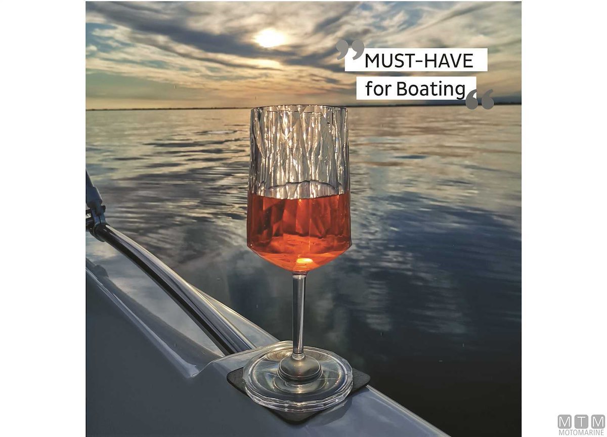Eleganti calici da vino Silwy in plastica di alta qualità con pratici magneti integrati sul fondo che ne rendono sicuro l’appoggio anche quando il mare è mosso. Rapporto di tenuta perfetto tra sottobicchiere e bicchiere. I sottobicchieri metallici in nano-gel sono rimovibili, durevoli, non lasciano residui e aderiscono a tutte le superfici. Forniti in set da 2 bicchieri, compresi di sottobicchieri in nano-gel metallizzati.