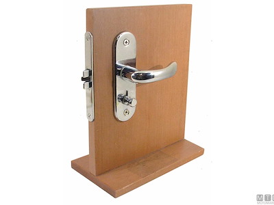 Set serratura da infilare con blocco di privacy interno e scontro antivibrante piano. Montaggio universale con mano destra o sinistra. Corpo in Ottone Cromato e componenti inossidabili. Completa di maniglie e placche.