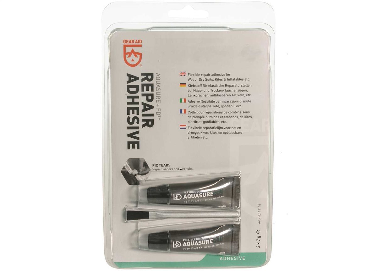 Adesivo sigillante in gomma poliuretanica per riparazioni impermeabili permanenti di forature, strappi e cuciture di attrezzature da pesca e sport acquatici, kayak, mute, stivali, tende e cerate. Flessibile, può ricostruire piccole parti mancanti senza l'uso di toppe.