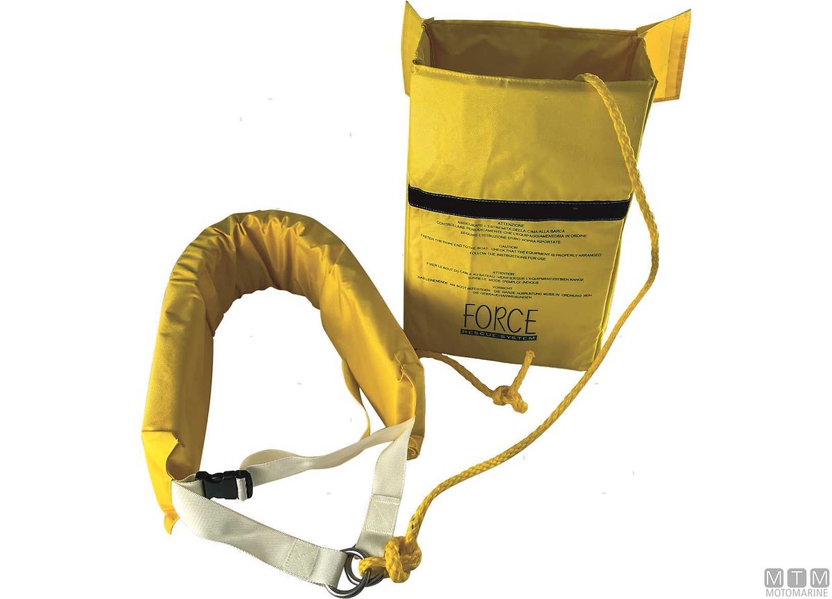 Sistema di recupero Safeling M.O.B. (Man Over Board - Uomo a Mare). Cintura galleggiante e 40 m di sagola conforme Dir. Europea 89/686 EEC. Contenitore con fibbie di fissaggio alla barca.