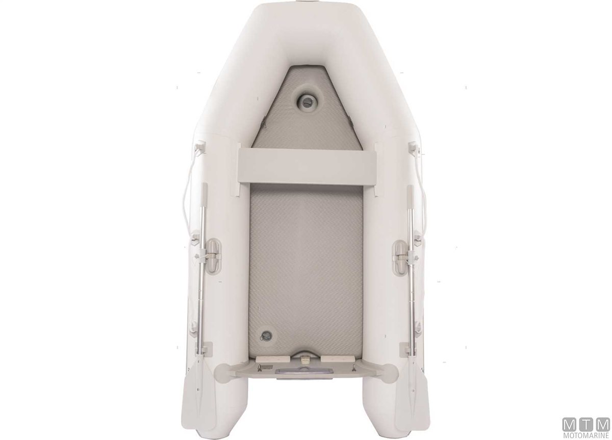 Tender realizzato in tessuto ad alta resistenza 1100D spalmato PVC termosaldato, equipaggiato con speciale chiglia gonfiabile a V in tessuto DropStitch e pagliolato Airmat che garantiscono rigidità strutturale, resistenza all’usura e stabilità di navigazione. I tubolari di ampio diametro con parabordo antispruzzo migliorano la protezione e il comfort a bordo. Facilmente sgonfiabile e riponibile in gavone. Fornito completo di gonfiatore, kit di riparazione, remi, panchetta, cima di ormeggio e sacca portabattello.