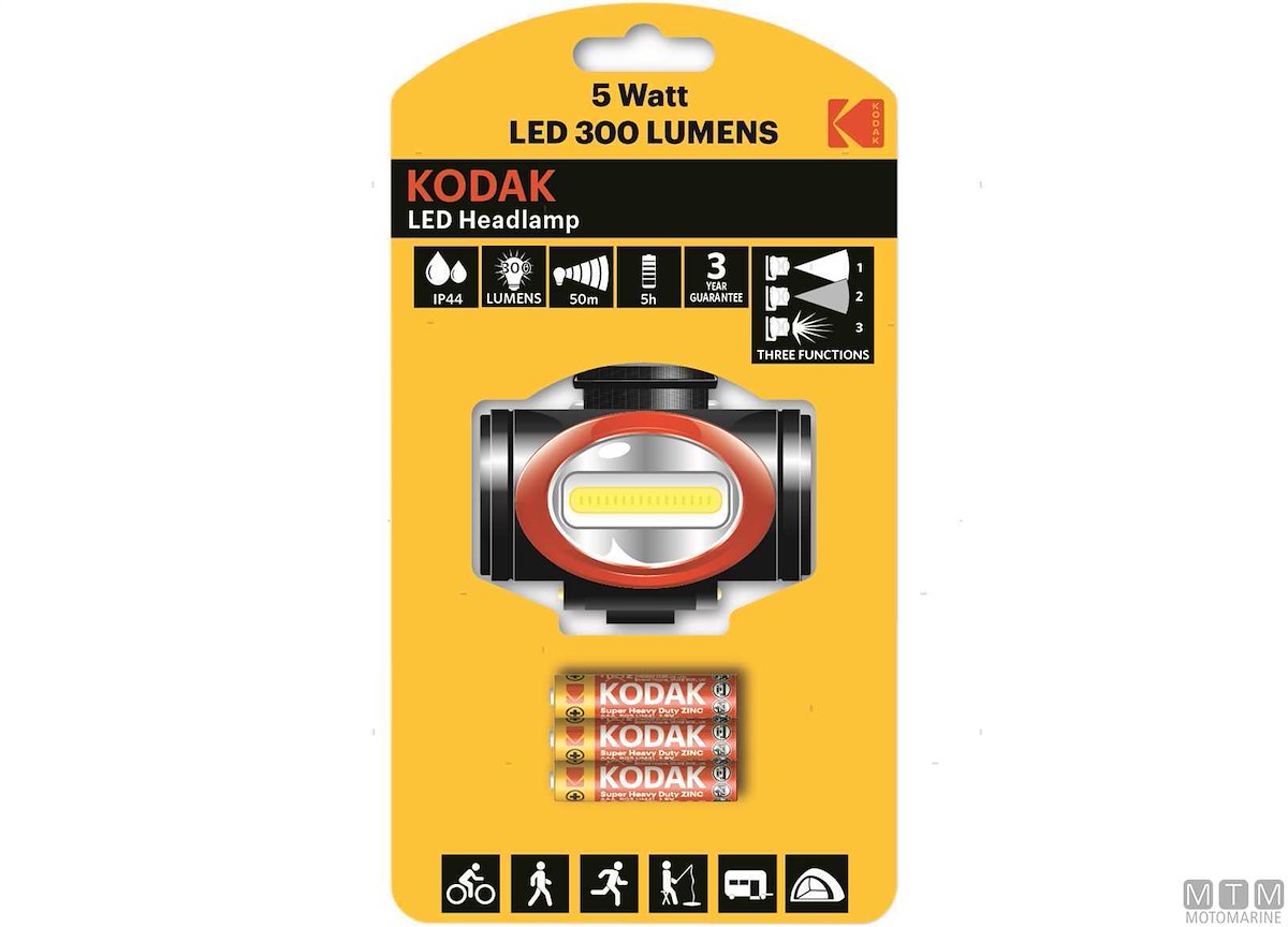 Torcia frontale Kodak LED ideale per avere le mani libere durante qualsiasi attivitĂ nautica o all'aperto. Faretto basculante con 300 lumen di luce e una portata di 50 m. Autonomia 5 ore, funziona con 3 batterie tipo AAA comprese nella confezione.